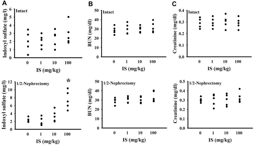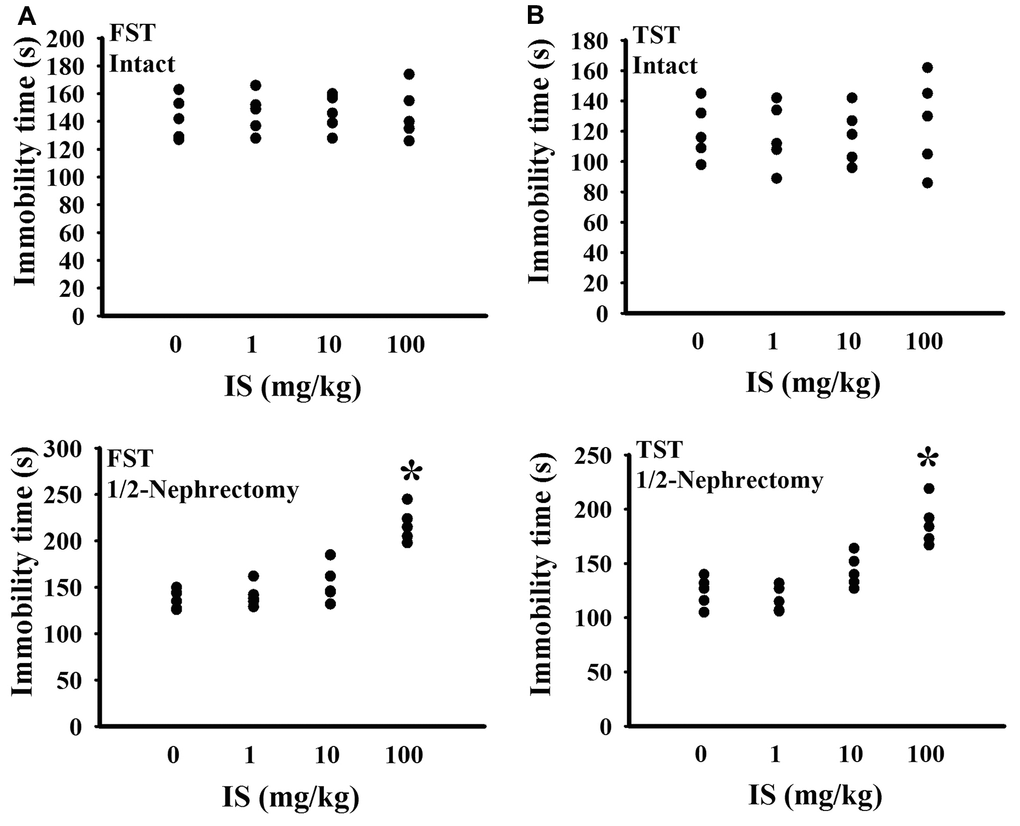 To find out potential effects of indoxyl sulfate, consequences of various doses (0, 1, 10, and 100 mg/kg) were primarily explored in mice with intact or unilateral nephrectomy. Only high doses at 100 mg/kg, unilateral nephrectomized mice elevated indoxyl sulfate level in blood circulation (p < 0.05, Figure 1A), while presented normal ranges of plasma Blood Urea Nitrogen (BUN) (p > 0.05, Figure 1B) and creatinine (p > 0.05, Figure 1C). Additionally, high dose indoxyl sulfate-exposed mice (100 mg/kg) showed an increased immobility time in the Forced Swimming Test (FST) (p < 0.05, Figure 2A) and Tail Suspension Test (TST) (p < 0.05, Figure 2B), implying potential CNS effects. Intriguingly, the effects of indoxyl sulfate were not duplicated in kidney intact mice (Figures 1, 2). Therefore, unilateral nephrectomized mice and indoxyl sulfate at dose of 100 mg/kg were utilized throughout all subsequent experiments.