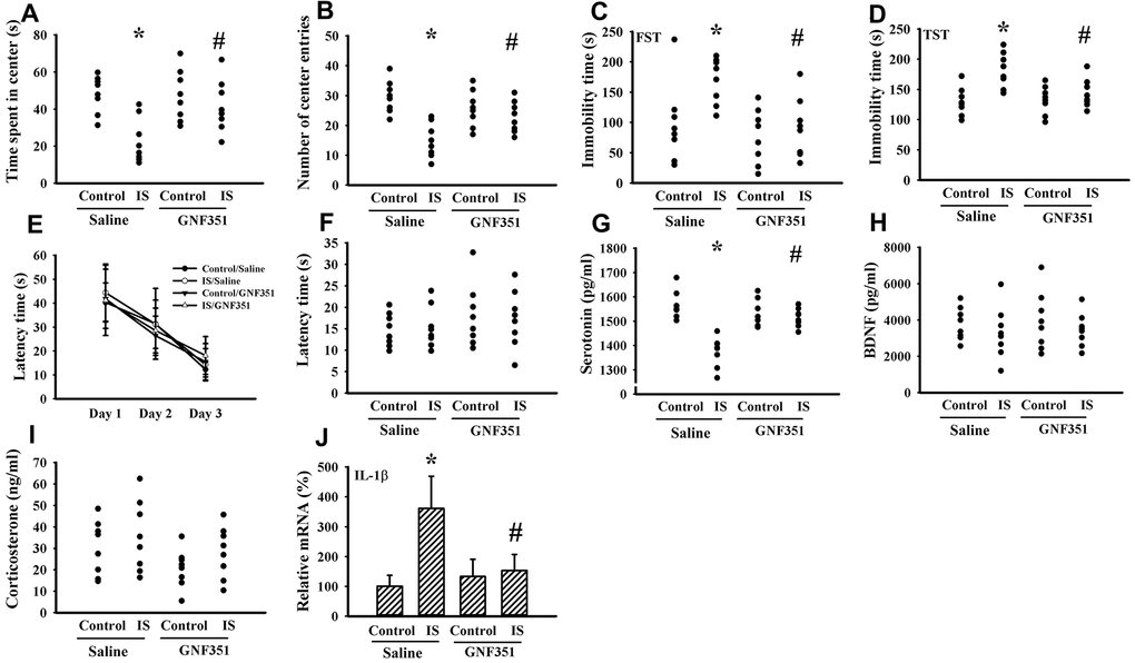 Indoxyl sulfate is a putative ligand for AhR and AhR antagonism mitigates inflammatory cytokine expression [37, 38]. To further elicit the CNS effects, indoxyl sulfate was administrated to normal intact mice once via intracerebroventricular infusion in the absence or presence of AhR inhibitor GNF351 [38]. Indoxyl sulfate-infused mice showed moderate alterations in the Open Field Test, FST, and TST by a decreased time spent in the central zone (p < 0.05, Figure 10A) and numbers of central zone entries (p < 0.05, Figure 10B), as well as an increased immobility time (p < 0.05, Figures 10C, 10D). Unexpectedly, escape latency time in the acquisition phase (p > 0.05, Figure 10E) and probe tests (p > 0.05, Figure 10F) was not statistically difference among groups in the Morris Water Maze Test. There was a reduction of circulating level of serotonin (p < 0.05, Figure 10G) in indoxyl sulfate-infused mice, while the levels of BDNF (p > 0.05, Figure 10H) and corticosterone (p > 0.05, Figure 10I) were not changed. Regarding neuroinflammation, an increased expression of IL-1β mRNA (p < 0.05, Figure 10J) was observed in the prefrontal cortical tissues of indoxyl sulfate-infused mice. Those alterations were alleviated by GNF351 (p < 0.05, Figures 10A, 10B, 10C, 10D, 10G, 10J). The findings suggest that indoxyl sulfate may possess some CNS effects involving AhR signaling.