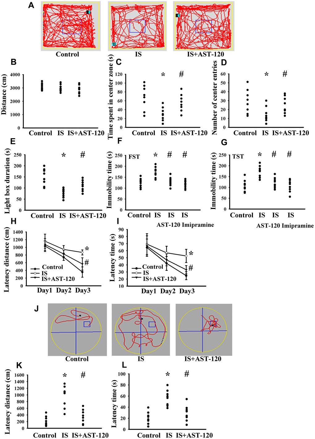 All behavioral tests were conducted during the light cycle phase in enclosed behavior rooms. The modified Open Field Test, FST, TST, Light-Dark Box Test, and Morris Water Maze Test were evaluated in accordance with previously reported methods by technicians blinded to the treatments [26–28]. In the Open Field Test, mice were placed on the apparatus (L x30 cm and W x30 cm) with 16 squares for a period of 30 min. Travel distance, time spent in the central zone, and numbers of central entries were measured. For the measurement of FST, and TST, mice were forced to swim for 5 min and individually suspended by the tail for 6 min, respectively, and the immobility time was recorded. To evaluate the effect of antidepressant, imipramine (20 mg/kg) was intraperitoneally administrated 1 h prior to the tests. For the Light-Dark Box Test, mice were placed in the apparatus (L x40 cm, W x30 cm, and H x30 cm) for a period of 5 min. The light and dark areas each constituted half of the available area within the box. In each experiment, the mouse was placed into the illuminated part of the box and the time that it remained there was recorded. In the Morris Water Maze Test, the evaluation was performed in an illuminated room with some external signs that remained in the same place during probe tests and training. The experimental apparatus consisted of a circular pool with a diameter of 150 cm at a depth of 60 cm. The water (25° C) was rendered opaque with powdered milk. The surface of the pool was virtually divided by four quadrants and the escape platform (10 cm in diameter) was located 1 cm below the water surface near the center of one quadrant of the pool. Mice received three acquisition trials per day for three consecutive days and the training trials were separated with 1 minute intertrial intervals. Mice were placed randomly in one of the quadrants and a maximum 90 seconds was allowed to find and climb the hidden platform. If mice failed to find the platform within 90 seconds, they were guided to the escape platform. Parameters of escape latency distance and latency time were measured. An average was calculated for three daily trials. On day 4, the time required to reach the hidden platform and the total distance traveled by the mouse were recorded. All swimming trials were recorded with a video camera placed on the ceiling and analyzed using Etho Vision 3.1 (Noldus, The Netherlands) software.