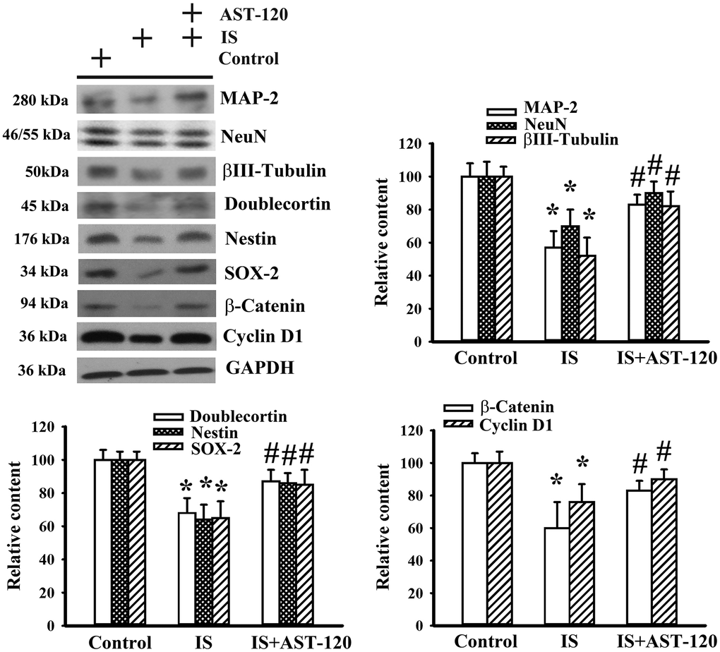 Histopathological changes in neurodegenerative diseases and depression are characterized by neuronal degeneration and impaired neurogenesis [28]. Thus, the effects of indoxyl sulfate on neuronal cell survival and neural stem cells, as well as the potential reversal effect of AST-120, were examined by Western blotting. Quantitative measurement of neuronal cell-associated Microtubule-Associated Protein 2 (MAP-2), NeuN, and β-III tubulin protein contents indicated a reduction of neuronal cells in indoxyl sulfate-treated mice (p < 0.05, Figure 5). Parallel reductions in protein contents of stem/progenitor biochemical markers of the neural lineage, including doublecortin, nestin, and SOX-2, as well as cell proliferation-associated β-catenin and cyclin D1 (p < 0.05, Figure 5) were noted. AST-120 alleviated the protein reduction in indoxyl sulfate-treated mice (p < 0.05, Figure 5). These findings indicate that indoxyl sulfate had a negative effect on neuronal cells and neural stem cell-associated genes, and that AST-120 reversed these effects.