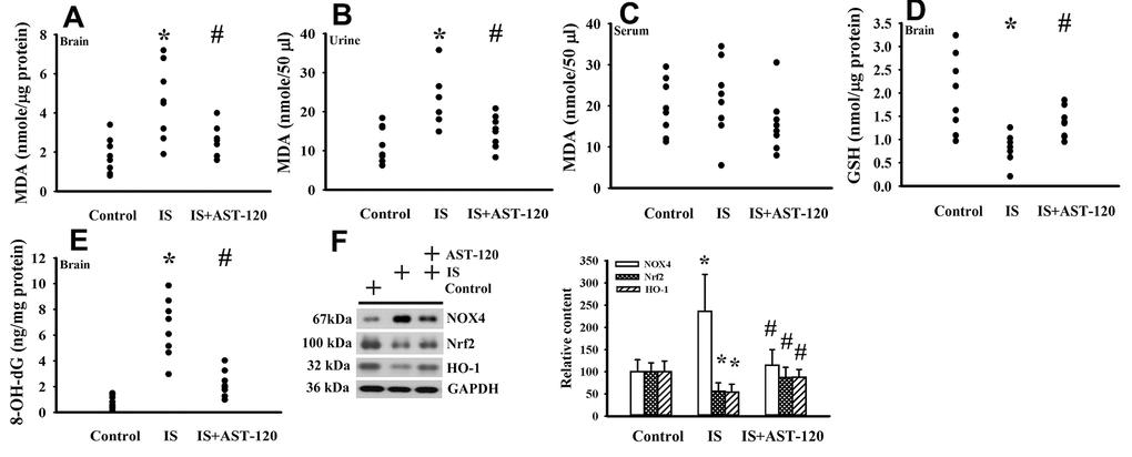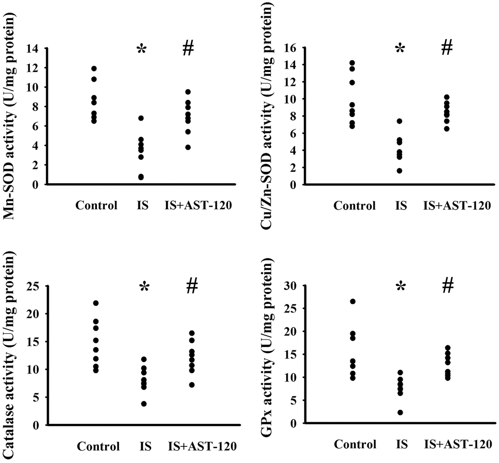 The generation of free radicals, which causes oxidative stress, has a remarkable impact on neuronal cell survival, neural stem cells, and synaptic connections, and thus has an active role in the pathogenesis of neuropsychological diseases and response to treatments [10, 26, 33, 34]. Increased levels of lipid peroxidation product Malondialdehyde (MDA) indicating oxidative stress were detected in the prefrontal cortical tissues (p < 0.05, Figure 7A) and urine (p < 0.05, Figure 7B), but not serum (p > 0.05, Figure 7C), of indoxyl sulfate-treated mice, and this effect could be reduced by AST-120 (p < 0.05, Figures 7A, 7B). The elevation of MDA level and reversal effect by AST-120 in the brain were accompanied by decreased Glutathione (GSH) content (p < 0.05, Figure 7D), increased 8-Hydroxy-2-Deoxyguanosine (8-OH-dG) content (p < 0.05, Figure 7E), elevated NADPH Oxidase 4 (NOX4) protein, and reduced NF-E2 Related Factor (Nrf2) and Heme Oxygenase-1 (HO-1) protein (p < 0.05, Figure 7F). Parallel changes were further demonstrated in Manganese-Superoxidase Dismutase (Mn-SOD) activity, Copper/Zinc-Superoxidase Dismutase (Cu/Zn-SOD) activity, Catalase activity, and Glutathione Peroxidase (GPx) activity (p < 0.05, Figure 8). These data suggest indoxyl sulfate has a pro-oxidative effect and that AST-120 can counter this effect.