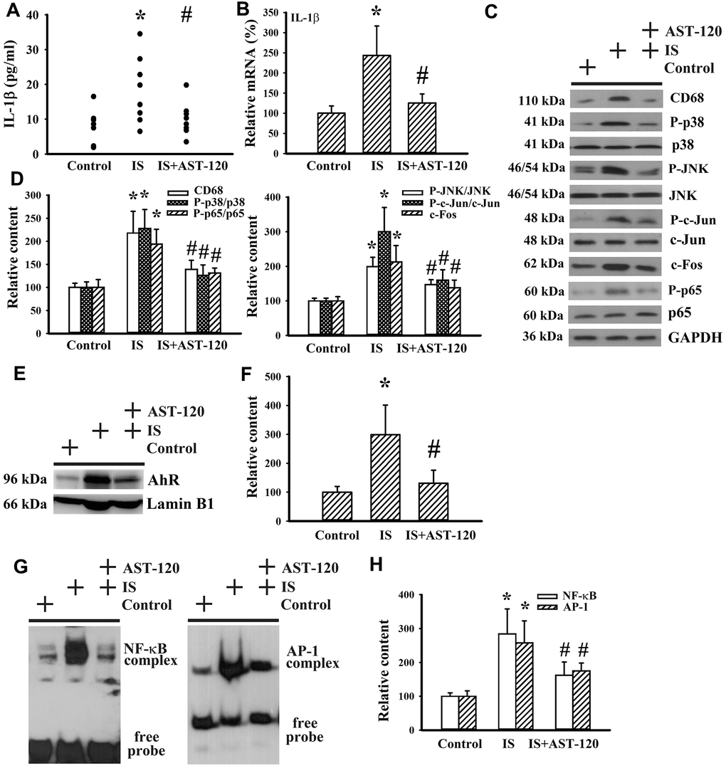 Neuroinflammation has been implicated in the pathogenesis of neuropsychological diseases and anti-inflammatory treatments have been demonstrated to ameliorate disease progression [10, 33–36]. Serum level of IL-1β protein (p < 0.05, Figure 9A) and prefrontal cortical tissue level of IL-1β mRNA (p < 0.05, Figure 9B) were elevated in indoxyl sulfate-treated mice. The induction of IL-1β expression was accompanied by increased protein expression of monocyte/macrophage-associated Cluster of Differentiation 68 (CD68), Aryl Hydrocarbon Receptor (AhR), and c-Fos, protein phosphorylation of p38, c-Jun N-terminal Kinase (JNK), c-Jun, and p65 (p < 0.05, Figures 9C–9F), and DNA binding activity of NF-κB and AP-1 (p < 0.05, Figures 9G, 9H), crucial signaling molecules and transcription factors in neuroinflammation. The alterations of neuroinflammation-associated molecules were alleviated by AST-120 (p < 0.05, Figures 9C–9H). These data suggest that AST-120 improved indoxyl sulfate-induced neuroinflammation.