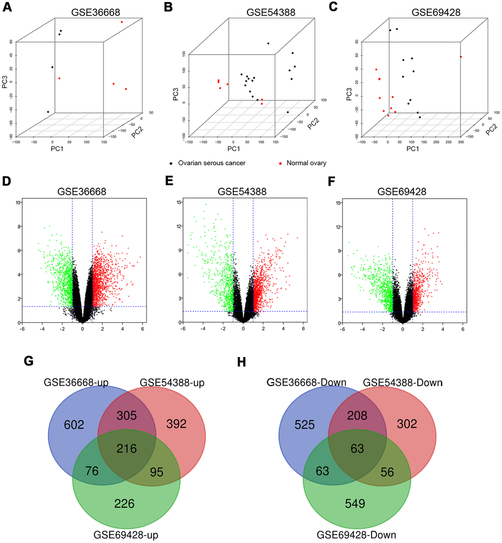 Three expression profiles (GSE36668, GSE54388, and GSE69428) were obtained from the GEO database, and the specific details were listed in Supplementary Table 1. These datasets, covering OSC tissues and normal ovary tissues, were both from patients with OSC, with GSE36668 including 4 OSC tissues and 4 normal ovary tissues, GSE54388 containing 16 OSC tissues and 6 normal ovary tissues, GSE69428 consisting of 10 OSC tissues and 10 normal ovary tissues (Supplementary Table 1). We evaluated these datasets by Principal component analysis (PCA) after data normalization (Figure 1A–1C and Supplementary Videos 1–3). Then, the heatmaps of gene expression in GSE36668, GSE54388 and GSE69428 were shown in Supplementary Figure 2A–2C. After gene annotation, the DEGs were screened in each data series with Log FC≥1 or Log FC≤-1 and p-value<0.05 as the criteria for selection. The GSE36668 dataset included 2058 DEGs, covering 1199 upregulated and 859 downregulated genes (Figure 1D); the GSE54388 dataset included 1637 DEGs consisting of 1008 upregulated and 629 downregulated genes (Figure 1E); the GSE69428 dataset included 1344 DEGs consisting of 613 upregulated and 731 downregulated genes (Figure 1F) as shown in Volcano plots. The details of significant DEGs from each dataset were displayed in Supplementary Table 2. Moreover, the overlap of co-DEGs in three datasets contained 279 genes, as Venn diagrams showed, consisting of 216 upregulated co-DEGs (Figure 1G) and 63 downregulated co-DEGs (Figure 1H) when compared with normal ovary samples.
