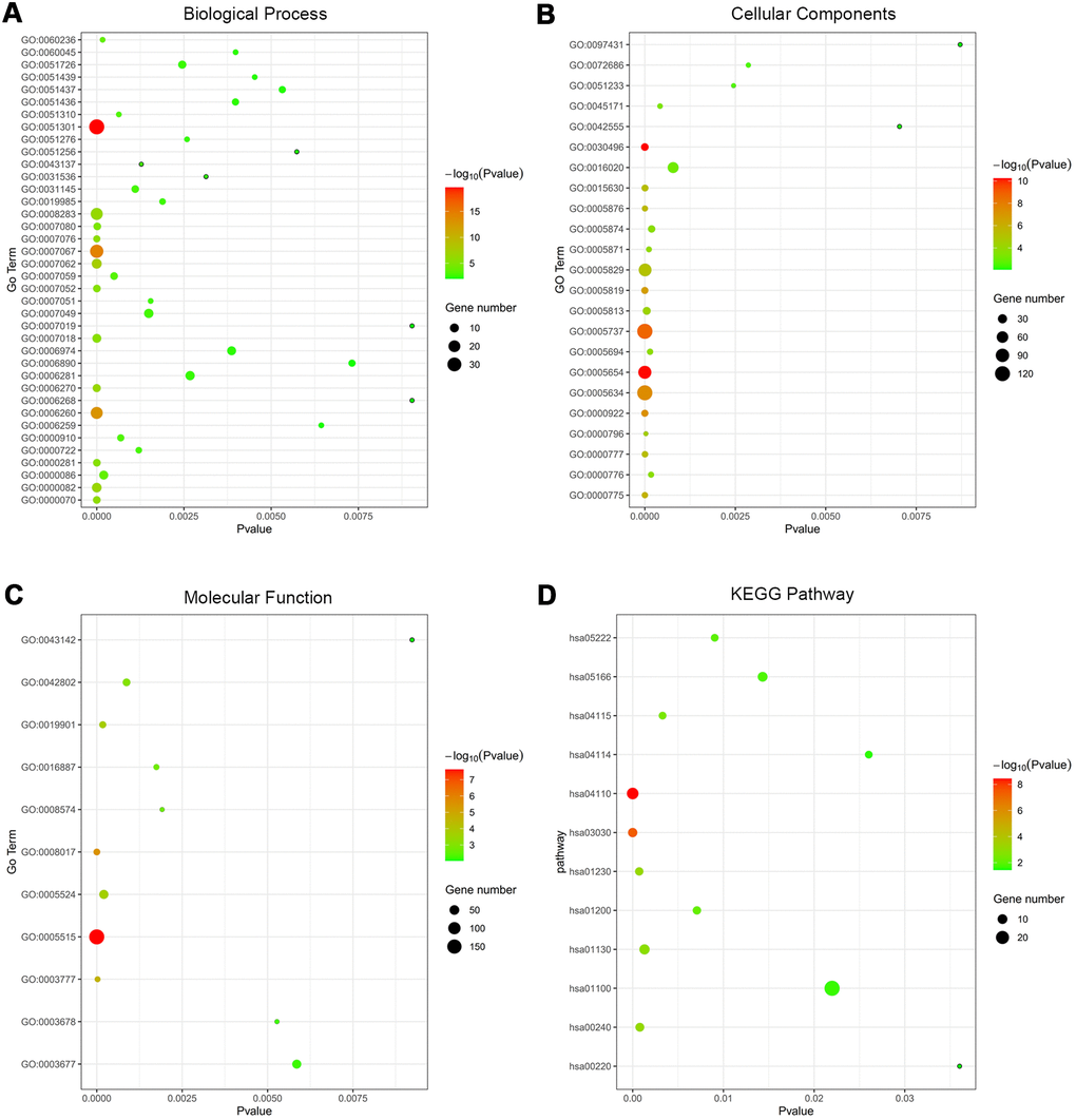 279 co-DEGs were subjected to GO enrichment for biological process (BP), molecular function (MF) and cellular component (CC) analyses according to criterion of p-value<0.01. The BP analysis of co-DEGs was mainly focused on the cell division (GO:0051301), mitotic nuclear division (GO:0007067) and DNA replication (GO:0006260) (Supplementary Table 3 and Figure 2A). For CC analysis, the co-DEGs were notably enriched in the midbody (GO:0030496), nucleoplasm (GO:0005654) and cytoplasm (GO:0005737) (Supplementary Table 3 and Figure 2B). Concerning the MF analysis, the co-DEGs were mostly enriched in protein binding (GO:0005515), microtubule binding (GO:0008017) and microtubule motor activity (GO:0003777) (Supplementary Table 3 and Figure 2C). In addition, we utilized the DAVID to categorize co-DEGs in the KEGG database. Subsequent results indicated that the co-DEGs were significantly involved in 12 signaling pathways, such as cell cycle (hsa04110), DNA replication (hsa03030), and biosynthesis of amino acids (hsa01230) (Supplementary Table 3 and Figure 2D).