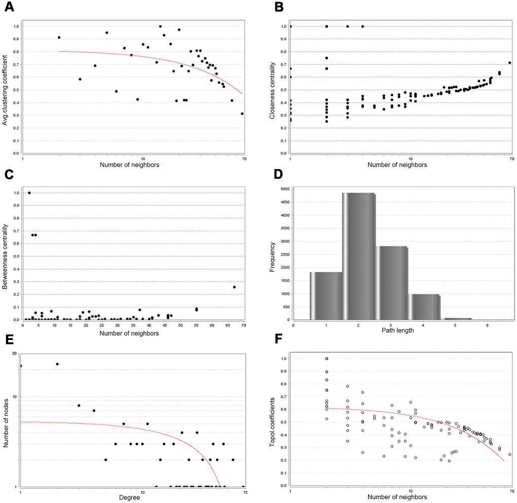 The NetworkAnalyzer package in Cytoscape was utilized to explore the topological parameters and centrality measures such as the Avg. clustering coefficient, distribution of the node degree, topological coefficients, shortest path length distribution, betweenness centrality, and closeness centrality for directed and undirected networks of co-DEGs PPIs backbone network.
