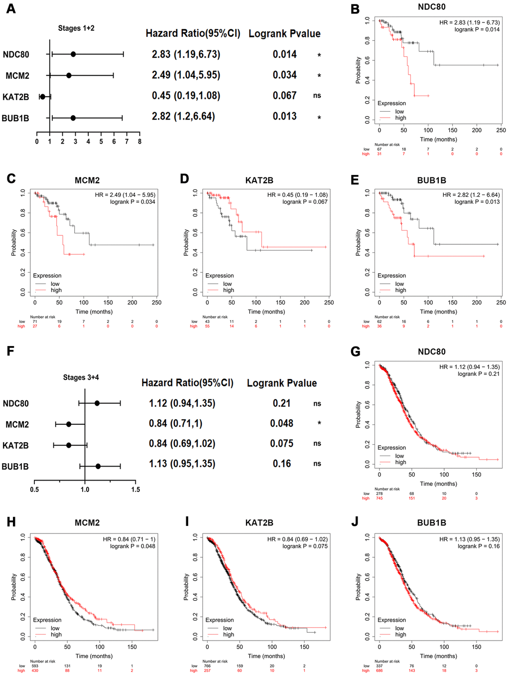 Then, the prognostic impact information of key genes on patients with OSC at different stages was explored by Kaplan-Meier plotter database (Figure 5). The key genes-related survival forest map at early stages (stages I+II) was shown in Figure 5A and relevant survival curves were respectively presented in Figure 5B–5E. The higher expression levels of NDC80 [HR=2.83 (1.19-6.73), logrank P=0.014] (Figure 5B), MCM2 [HR=2.49 (1.04-5.95), logrank P=0.034] (Figure 5C) and BUB1B [HR=2.82 (1.2-6.64), logrank P=0.013] (Figure 5E) were notably related to poor overall survival at early stages in OSC patients. Meanwhile, the key genes-related survival forest map at advanced stages (stages III+IV) was shown in Figure 5F and relevant survival curves were respectively presented in Figure 5G–5J, indicating that only one of four key genes was notably associated with the overall survival of OSC patients at advanced stages (Figure 5G–5J), in that high expression of MCM2 [HR=0.84 (0.71-1), logrank P=0.048] (Figure 5H) was associated with improved overall survival in OSC patients at advanced stages. In summary, BUB1B and NDC80 were deemed as the core genes for early diagnosis of patients with OSC.