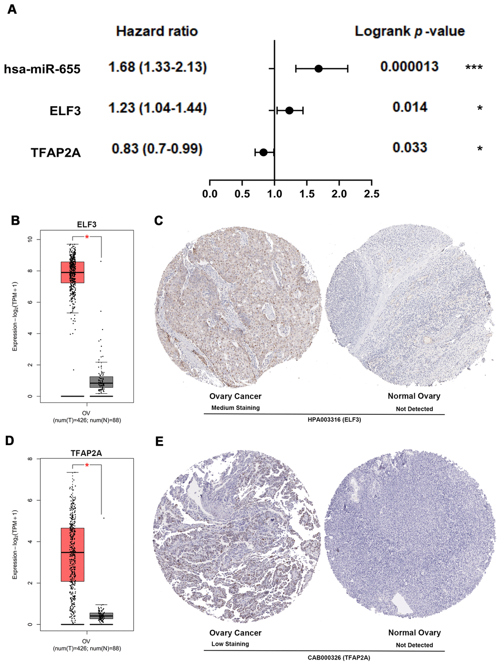 The expression of core genes including BUB1B (Supplementary Figure 8A) and NDC80 (Supplementary Figure 8B) were significantly increased in OSC patients among GSE36668, GSE54388 and GSE69428 datasets. BUB1B (Supplementary Figure 9A) and NDC80 (Supplementary Figure 9C) were validated at a transcription level in multiple cancer types based on the Oncomine database in that BUB1B (Median rank 132, p-value=1.54e-06) (Supplementary Figure 9B) and NDC80 (Median rank 192.5, p-value=4.04e-08) (Supplementary Figure 9D) were highly expressed in ovary cancer samples compared with normal ovary tissues. As for prognostic value of core TF, EMT regulator and miRNA, high expression of TFAP2A [HR=0.83[0.7-0.99], logrank P=0.033] was associated with the improved overall survival in OSC patients by Kaplan-Meier plotter (Figure 8A). However, the high expression of hsa-miR-655 [HR=1.68[1.33-2.13], logrank P=0.000013] and ELF3 [HR=1.23[1.04-1.44], logrank P=0.014] was linked with worse overall survival in OSC patients (Figure 8A). The expression levels of the EMT regulator and core TF were presented based on TCGA and GTEx data (Figure 8B, 8D), with consistent expression trend in three datasets (Supplementary Figure 8C, 8D). Moreover, the protein levels of EIF3 (Figure 8C) and TFAP2A (Figure 8E) were significantly higher in ovary cancer tissues than in normal ovary tissues based on HPA database. Furthermore, in the CCLE database, the expression levels of BUB1B (Supplementary Figure 10A), NDC80 (Supplementary Figure 10B), ELF3 (Supplementary Figure 10C), TFAP2A (Supplementary Figure 10D) and hsa-miR-655 (Supplementary Figure 11A) were confirmed among different ovarian cancer cell lines. Additional qRT-PCR also detected the consistent expression trend in SKOV3 cell line with CCLE (Supplementary Figure 10E–10H). Then, we explored the decreased expression of hsa-miR-655 and increased expression of has-miR-200a in ovarian cancer from the miRCancer database. At the same time, compared with normal blood samples, we also found the expression of hsa-miR-655 decreased and hsa-miR-200a increased in blood samples of patients with ovarian cancer (Supplementary Figure 11B, 11C and Supplementary Table 8).