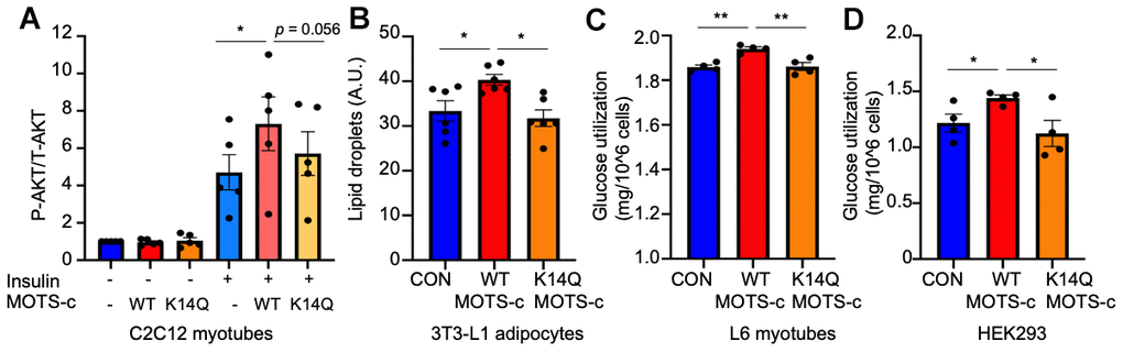 To examine the insulin sensitizing effect of MOTS-c and its variant, we treated cells with insulin in the absence or presence of WT or K14Q MOTS-c in differentiated C2C12 myotubes. Upon insulin stimulation, insulin receptor tyrosine kinase activates AKT via PI3K. AKT phosphorylation by insulin is higher in WT MOTS-c than in the control and in K14Q MOTS-c treatment in differentiated C2C12 myotubes (Figure 1A). WT MOTS-c further increased AKT phosphorylation in the presence of insulin, whereas K14Q MOTS-c showed a blunted response to insulin-stimulated AKT phosphorylation in the presence of insulin in differentiated C2C12 myotubes (Figure 1A). In addition, insulin plays an important role in adipocyte differentiation. Hence, we used 3T3-L1 pre-adipocyte differentiation as another model to assess insulin sensitivity. During 3T3-L1 pre-adipocyte differentiation, cells were incubated with insulin (1-μg/mL) containing medium. We treated cells with insulin (0, 0.5, and 1-μg/mL) in the presence or absence of WT MOTS-c. MOTS-c increased lipid droplets only in the presence of insulin, suggesting MOTS-c has an insulin sensitizing effect on adipocyte differentiation (data not shown). Next, we treated cells with WT and K14Q MOTS-c in the presence of 1μg/mL insulin. WT MOTS-c, but not K14Q MOTS-c increased lipid droplets during adipocyte differentiation (Figure 1B). Next, differentiated L6 myotubes were treated with WT and K14Q MOTS-c. Glucose levels were measured in the conditioned medium. WT MOTS-c increased glucose uptake, whereas K14Q MOTS-c was less effective at enhancing insulin-stimulated glucose uptake than WT MOTS-c (Figure 1C). We also transiently transfected HEK293 cells with WT MOTS-c and K14Q MOTS-c and measured glucose uptake. WT MOTS-c increased glucose uptake, whereas K14Q MOTS-c effects were the same as the control plasmid (Figure 1D). Taken together, our in vitro studies show that K14Q MOTS-c has a dramatically diminished action as an insulin sensitizer compared to WT MOTS-c.