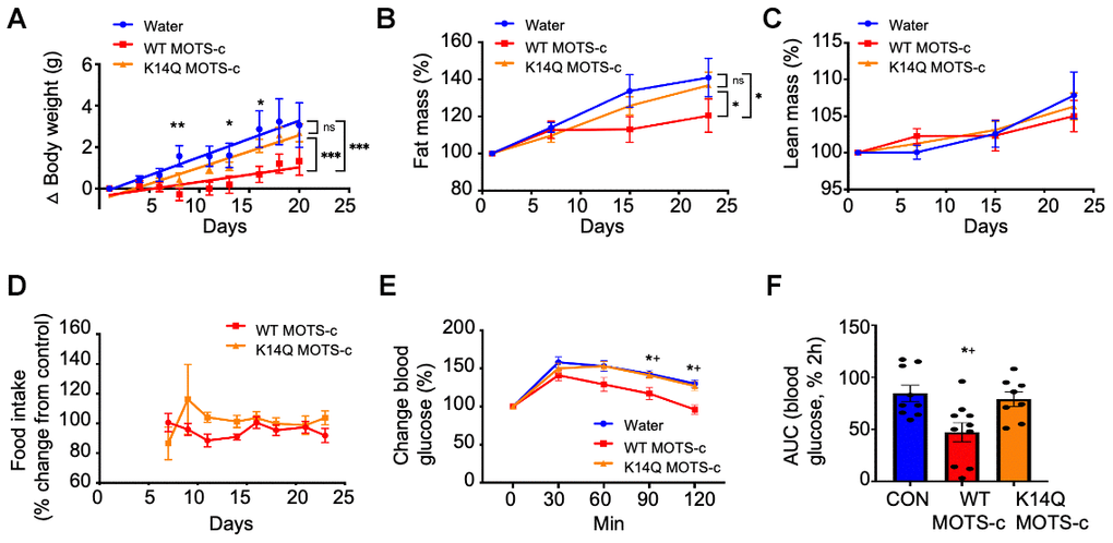 As MOTS-c has beneficial effects on metabolism and acts as an exercise mimetic, we speculated that individuals who carry the C allele, which produces the K14Q MOTS-c peptide will have a reduced insulin-sensitizing effect compared to WT MOTS-c in animal models. Previous studies of exogenous MOTS-c treatment in mice showed a substantial effect of improving insulin action and since peptide treatments are clinically translatable, we treated mice with exogenous WT- and K14Q MOTS-c. We investigated the effect of WT and K14Q MOTS-c in a diet-induced obesity mice model. We administered WT and K14Q MOTS-c (7.5 mg/kg; twice daily (BID); IP) to CD1 male mice fed a high-fat diet (HFD, 60% by calories) to examine the roles of K14Q MOTS-c in diet-induced metabolic alterations. Our previous studies showed that MOTS-c reduced body weight gain and fat mass, improved insulin sensitivity in skeletal muscle, and heightened energy expenditure in HFD-fed CD1 male mice. In this study, we confirmed our previous findings showing that WT MOTS-c significantly reduced weight gain in high-fat diet-fed male mice (Figure 2A). In contrast to WT MOTS-c, K14Q MOTS-c failed to protect against HFD-induced weight gain, showing no effect in vivo; total body weight was identical between K14Q MOTS-c and water-treated controls (Figure 2A). Moreover, HFD feeding induced a similar fat-weight increase in K14Q MOTS-c and water-treated control, whereas WT MOTS-c showed a reduction in fat-weight compared to controls after 3 weeks of HFD consumption (Figure 2B). There was no effect on lean mass in the HFD-fed mice treated with either WT or K14Q MOTS-c (Figure 2C). Although body weight was lower in the WT MOTS-c treated group, food intake was identical between the three groups (Figure 2D). Since MOTS-c increased cellular glucose uptake and increased insulin sensitivity in vitro, we hypothesized its actions in vivo would be related to glucose clearance indicative of improved insulin sensitivity. We treated mice with WT MOTS-c and K14Q MOTS-c for 21 days and then subjected them to a glucose tolerance test (GTT). We observed that WT MOTS-c significantly enhanced glucose clearance, whereas the glucose tolerance curves were not different between K14Q MOTS-c and water-treated group (Figure 2E, 2F). Taken together, K14Q MOTS-c is a far less effective metabolic regulator in male mice in vivo compared to WT MOTS-c (showing no discernable effects at the doses tested here).