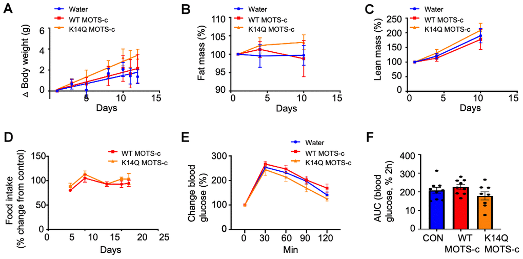 To identify potential sex difference in MOTS-c effects in mice, we administrated WT and K14Q MOTS-c (7.5 mg/kg; BID; IP) in CD1 female mice fed a HFD (60% by calories). Unlike male mice, female mice did not respond to WT MOTS-c treatment (Figure 3A). Female mice injected with K14Q MOTS-c showed no effect either (Figure 3A). Fat mass, lean mass, and food intake were also not altered in WT or K14Q MOTS-c-injected female mice (Figure 3B–3D). We also administrated female mice with WT MOTS-c and K14Q MOTS-c for 21 days and then subjected them to a glucose tolerance test (GTT). We observed that glucose curves for both WT MOTS-c and K14Q MOTS-c were not different from controls (Figure 3E, 3F).