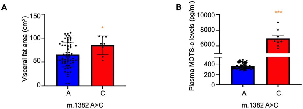 This study was approved by the ethical committee of the Faculty of Medicine at the University of Tsukuba, conformed to the principles outlined in the Helsinki Declaration, and all participants were provided written informed consent before inclusion. Participants were recruited through local newspaper advertisements and personal contacts around Tsukuba-city in Japan. A total of 75 subjects (age range: 43-80 years old) were included in the analyses. Visceral fat area was measured using the dual-impedance analysis method (HSD-2000; Omron Healthcare, Kyoto, Japan) [51]. Blood samples were taken in the morning after 12-h overnight fast. Total DNA was isolated form plasma samples by using QIAamp DNA Blood Mini Kit (Qiagen, Hilden, Germany), according to the manufacturer’s instructions. m.1382A>C (rs111033358) polymorphism was analyzed by digital droplet PCR mutation detection assays according to the manufacturer’s instruction (Biorad, Cat#10049047).