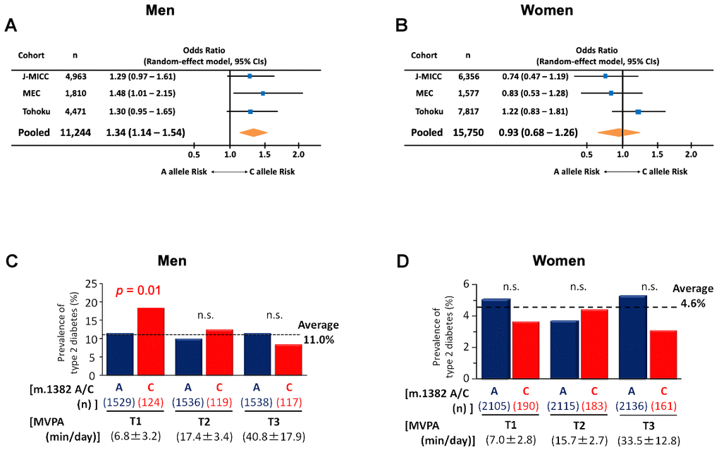 MEC is a population-based prospective cohort study including approximately 215,000 men and women from Hawaii and California that is part of the Population Architecture using Genomics and Epidemiology (PAGE) study. All participants were 45-75 years of age at baseline, and primarily of 5 ancestries: Japanese Americans, African Americans, European Americans, Hispanic/Latinos, and Native Hawaiians. All cohort members completed baseline and follow-up questionnaires. For the current study, MEC contributed data from Japanese Americans with T2D and Japanese American case-control subjects (1,799 cases and 1,588 controls), both men and women with complete covariate data. Single variant association testing was completed among 3,387 MEC Japanese Americans with complete genotype data for the m.1382A>C variant (rs111033358). A logistic regression model adjusted for age and BMI was used to identify stratified gender specific associations. All analyses were performed in SAS and adjusted beta values, odds ratios, 95% confidence intervals and p-values were reported.