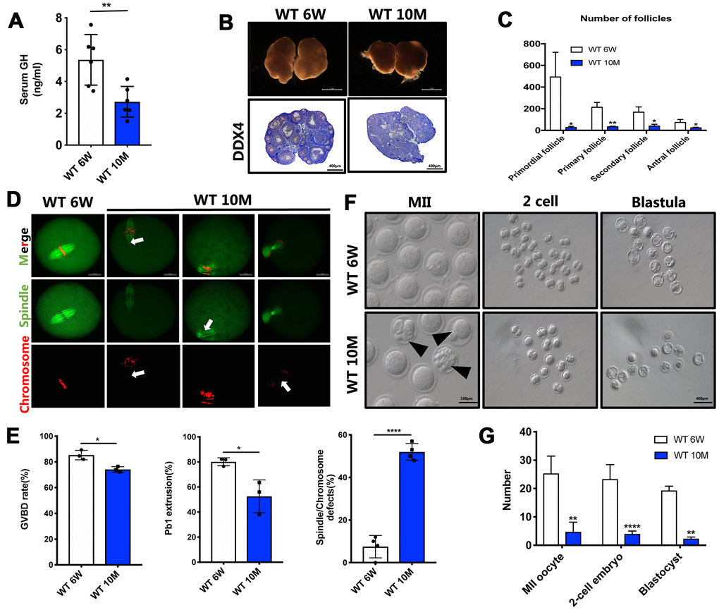 We first investigated GH levels in peripheral blood during maternal aging, and the results showed a two-fold decrease of GH levels in 10-month-old mice (Figure 1A). Ovary tissues were then retrieved from both aged and young mice and assessed with HE staining. There were fewer and smaller oocytes in the aged ovaries (Figure 1B). On the basis of follicle counts, a prominent decrease in the number of follicles at all developmental stages was observed in aged mice compared with young ones (P < 0.05) (Figure 1C). In the meanwhile, the germinal vesicle breakdown (GVBD) rate (74.13%) and polar body extrusion (PBE) rate (52.57%) were severely impaired by maternal aging (Figure 1E; P < 0.05). Moreover, the frequencies of irregularly assembled spindles and misaligned chromosomes (52%) remarkably increased in aged oocytes compared with young oocytes (7.5%) (Figure 1D, 1E; P < 0.0005). Additionally, after MII oocytes from young and aged mice were fertilized in vitro, more abnormal and fragmented oocytes were observed in aged mice. Importantly, the potential of MII oocytes derived from aged mice to develop into the two-cell stage and further into blastula embryos was also significantly reduced (Figure 1F, 1G; P < 0.01). Collectively, oocyte quality and their potential to develop into surviving embryos could be gravely impacted by advanced maternal age, which is accompanied by a reduction of GH levels.