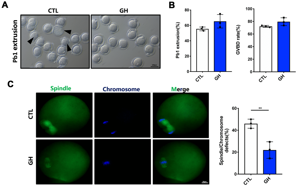 In order to assess the effects of GH on aged oocytes, oocytes were treated with GH (50 ng/mL) in maturation medium in vitro. We calculated the rates of GVBD and PBE after 4 and 14 h. There was an increasing tendency in the rates of GVBD (79.57%) and PBE (65.37%) compared with the control group (72.15% and 55.46%) (Figure 2A, 2B). Additionally, the incidence of disordered spindles with misaligned chromosomes (21.97%) was significantly lower in the GH group (Figure 2C; P < 0.01).