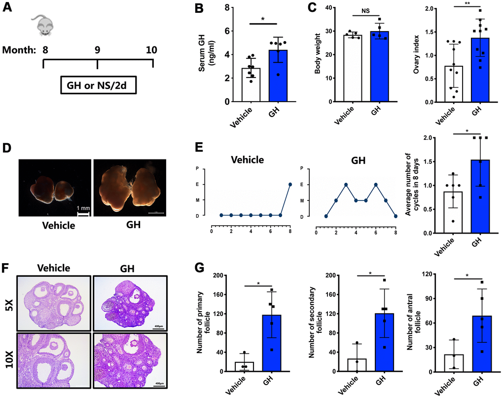 Though mice are a suitable model to study administration methods, dosages, and duration and to investigate ovarian storage and oocyte quality, few relevant studies have been published. The efficacy and underlying mechanisms of GH treatment in older mammals are therefore poorly understood. In the present study, the ovarian reserve of aged mice was remarkably ameliorated after eight weeks of in vivo GH supplementation, which was comprehensively demonstrated by the evident increases in the numbers of follicles at all stages and matured oocytes. Meiotic defects were restored, and the capacity of embryo formation was enhanced in the GH group, suggesting a vital advancement in oocyte quality. Considering the fact that in vitro culture experiment showed a mild improvement of oocyte development after GH treatment, while in vivo injection of GH increased ovarian reserve significantly, we believed that GH treatment improved not only the oocyte but also the ovarian somatic cells. More experiments should be carried to further understand the effect of GH on ovarian somatic cells, which will contribute to the clinical application. Collectively, these results are not completely consistent with the outcomes from clinical trials, implying that extended durations of GH administration may add to the improvement of ovarian functions.