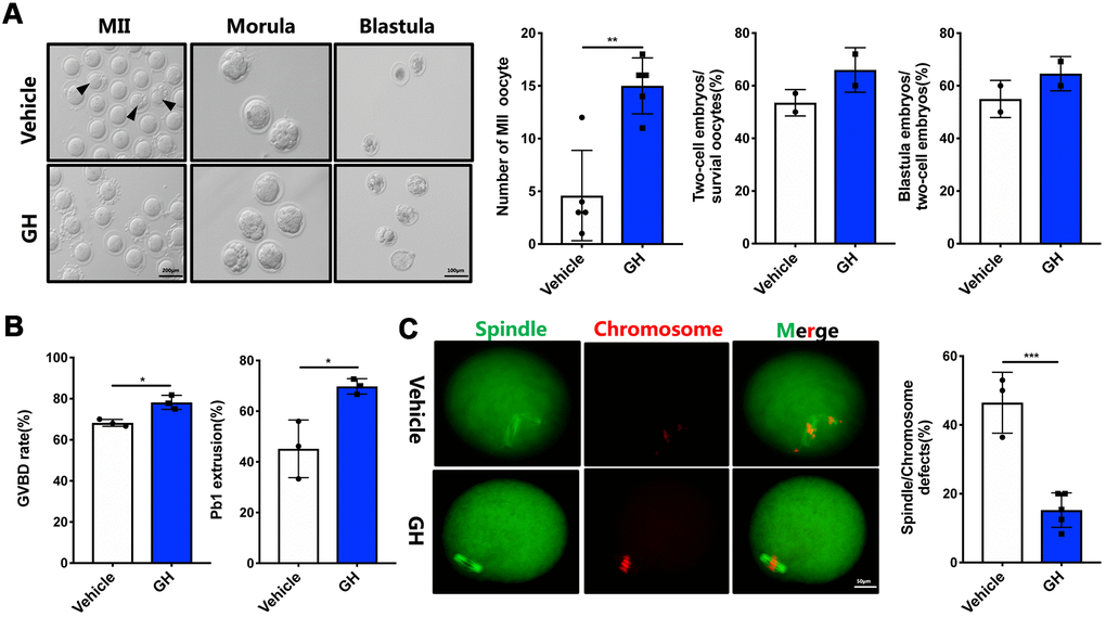 In order to further test the potential effects of GH on oocyte quality in vivo, IVF experiments were performed using oocytes obtained from NS-treated and GH-treated mice. Apart from the morphology of oocytes, the number of MII oocytes (15 oocytes/mouse) and the ability to develop blastocysts (64.6%) were increased following treatment with GH (Figure 4A; P < 0.01). Furthermore, oocytes from mice treated with GH showed higher rates of GVBD (78.2%) and PBE (69.8%) than those of the control group (68.23% and 45.17%) (Figure 4B; P < 0.05). In addition, oocytes from the GH group presented a lower frequency of spindle and chromosome disorganization (15.25%) (Figure 4C; P < 0.001). Taken together, these results suggest that exposure to GH improves oocyte quality and prevents meiotic failure resulting from maternal aging.