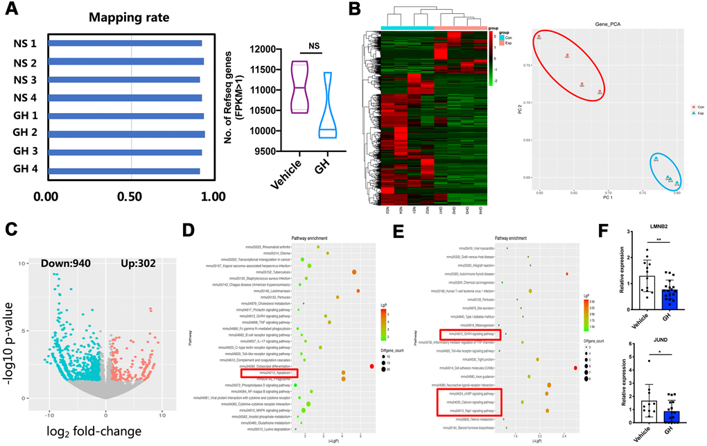 To investigate the mechanisms underlying the effects of GH treatment, single oocyte sequencing analysis was performed on four NS-treated and four GH-treated MII oocytes. As shown in Figure 5A, the mapping rate of each sample was above 90%. There was no significant difference in the number of expressed genes (FPKM > 1) between two groups, and principal component analysis verified that there were two clear groups, which corroborated the reliability of the data (Figure 5B). The transcriptome of oocytes from the GH group was remarkably different from that of oocytes from the NS group, as shown in the heatmap and the volcano plot. Of all differentially expressed genes, 940 genes were downregulated and 302 genes were upregulated after GH supplementation (Figure 5B, 5CSupplementary Table 1). The expressions of two selected differentially expressed genes were confirmed by single oocyte quantitative real-time PCR (qPCR) (Figure 5F; P < 0.05, P < 0.01). KEGG pathway analysis showed that the pathway associated with apoptosis, which is related to the survival and quality of oocytes, was significantly downregulated in the GH-treated group (Figure 5D). In contrast, among upregulated genes, the enriched KEGG pathways were associated with GnRH signaling, cAMP signaling, calcium signaling, and Rap1 signaling (Figure 5E).