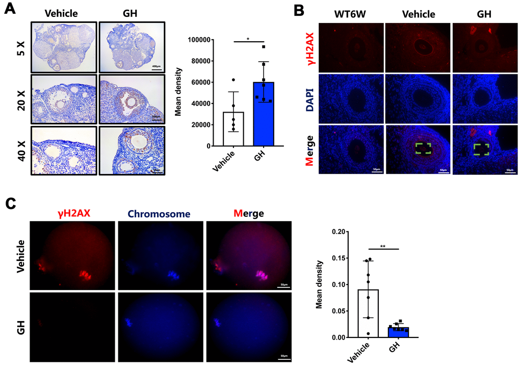 In conclusion, GH supplementation can ameliorate the ovarian reserve and oocyte quality in aged mice by reducing DNA damage and apoptosis. More studies should be carried to set a standard for the indications, dosages, and duration of GH treatment in clinical application.