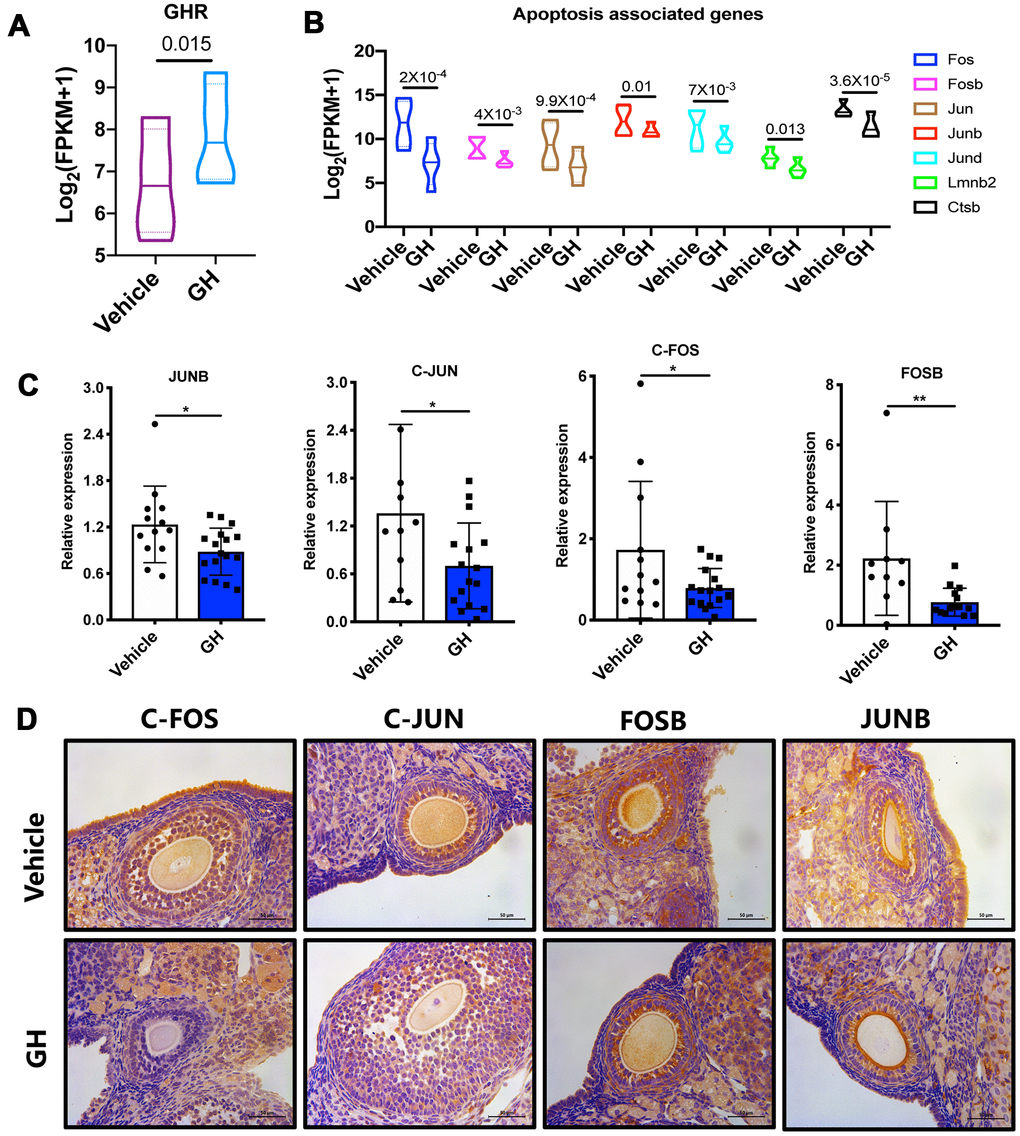 To explore the mechanisms by which GH reduces oocyte apoptosis, GH signaling activity was analyzed. Higher expression levels of GHR were observed in the GH group (Figure 7A; P = 0.015). The Fos and Jun families play important roles in apoptotic cell death; the expression levels of genes such as c-Fos, Fosb, c-Jun, and Junb were greatly declined in oocytes under GH treatment (Figure 7B). The expressions of these genes in GH-treated and NS-treated oocytes were verified using single oocyte qPCR. The immunohistochemistry results further proved that GH could decrease the gene expression levels of the Fos and Jun families (Figure 7C, 7D). Taken together, GH treatment induced an increase in GHR levels in aged oocytes and inhibited apoptosis via lowering the expression of Fos and Jun (Figure 8).