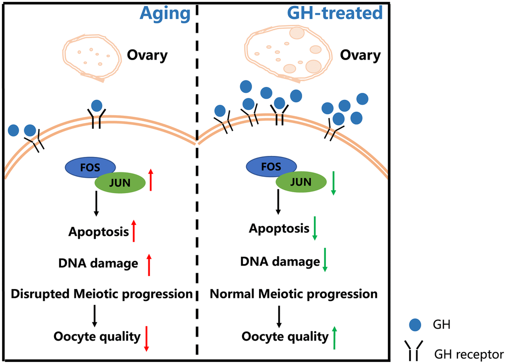 Due to the difficulty in observing follicles at different stages and the preciousness of MII oocytes derived from clinical patients undergoing IVF, there is a need to systematically verify the efficacy of GH treatment and investigate the underlying mechanisms in animal models. In the present study, it is shown that the decline in GH levels and the deterioration of oocyte quality result from maternal aging, and that both in vivo and in vitro treatment of GH restored reproductive function in mice. By single oocyte transcriptome analysis, we further determined that GH treatment can reduce apoptosis and DNA damage by decreasing the expressions of the Fos and Jun gene families.