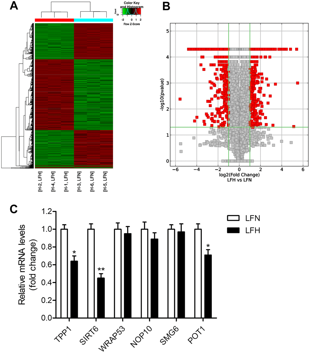 High-throughput transcriptomic sequencing was used to compare patterns of gene expression in LFH and LFN samples. Briefly, tissue RNA was extracted with TRIzol (Invitrogen, CA, USA), after which chloroform and isopropyl alcohol were used to precipitate this RNA. Sequencing and subsequent bioinformatics analyses were conducted by Cloud-Seq Biotech (Shanghai, China). Briefly, total RNA was treated with a Ribo-Zero rRNA Removal Kits (Illumina) to remove rRNA based on the manufacturer’s instructions, after which RNA libraries were constructed using rRNA-depleted RNAs with a TruSeq Stranded Total RNA Library Prep Kit (Illumina) according to the manufacturer’s instructions. Libraries were then subjected to quality control and quantification using the BioAnalyzer 2100 system (Agilent Technologies, USA), and 10 pM libraries were denatured to yield single-stranded DNA molecules that were captured on Illumina flow cells, amplified in situ as clusters and finally sequenced for 150 cycles on an Illumina HiSeq Sequencer as per the manufacturer’s instructions.