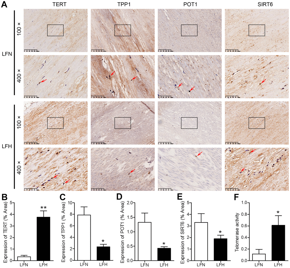 Paraffin-embedded LF tissue samples were cut into 4μm-thick sections, after which they were deparaffinized using xylene. Sections were then treated using 3% H2O2 in order to quench endogenous peroxidase activity, followed by a 30-minute incubation with citrate buffer in a steamer to mediate antigen retrieval. Sections were then stained overnight with anti-TPP1 (#ab54685, 1:100, Abcam), anti-POT1 (#10581-1-AP, 1:200, Proteintech, Wuhan, China), anti-SIRT6 (#ab62739, 1:200, Abcam), or anti-TERT (#382962, 1:200, ZenBio, Chengdu, China) at 4° C, followed by a 45-minute incubation with HRP-linked goat anti-rabbit IgG (#ab205718, 1:20000, Abcam) or goat anti-mouse IgG (#ab6789, 1:500, Abcam) at room temperature. DAB was then used for specific protein detection in these samples, which were then rinsed and counterstained with hematoxylin for 30 seconds. Samples were then analyzed via light microscopy (Olympus Optical, Tokyo, Japan) and assessed with the ImageJ software.