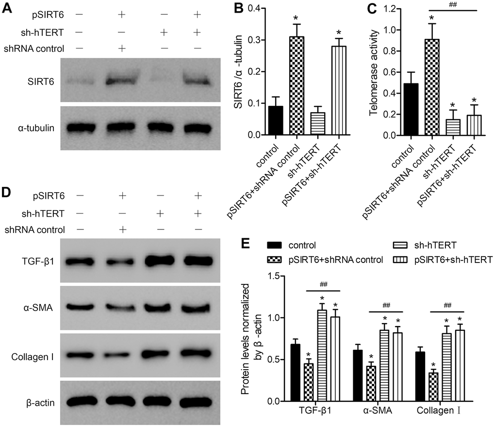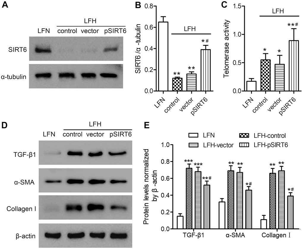 We next assessed the impact of SIRT6 on LF cell functionality by transducing LFH cells for 48 h with a lentivirus encoding human SIRT6, resulting in significant protein-level SIRT6 upregulation relative to untransfected LFH control cells (Figure 3A, 3B and Supplementary Figure 1). This SIRT6 overexpression was associated with significantly enhanced telomerase activity, although this activity remained at a low level in LFN cells (Figure 3C). SIRT6 overexpression was also associated with significant reductions in TGF-β1, α-SMA, and collagen I protein levels in LFH cells (Figure 3D, 3E and Supplementary Figure 2). Together, these findings suggest that SIRT6 can suppress the myofibroblastic differentiation of LFH cells by enhancing telomerase activation.