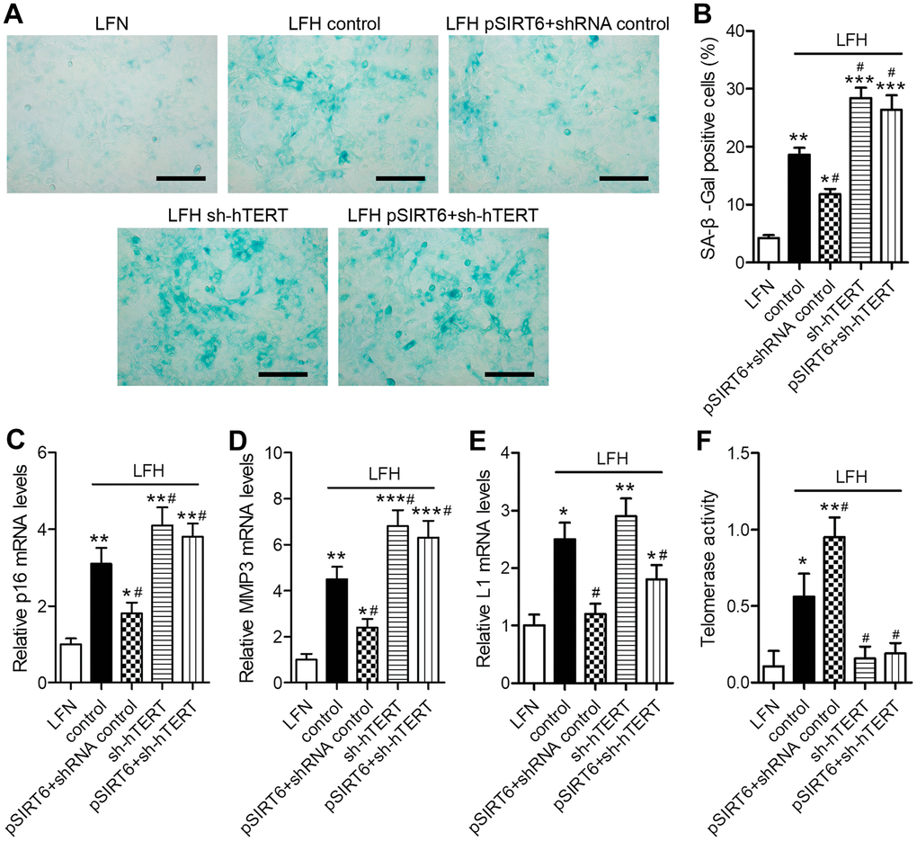 To assess the functional importance of SIRT6 and telomerase activity in the context of LF cellular senescence, we next conducted SA-β-gal staining in these cells at 48 h after SIRT6 overexpression and/or hTERT knockdown (Figure 5A). SA-β-gal staining was increased at baseline in LFH cells relative to LFN cells (18.6% vs. 4.2%). SIRT6 overexpression significantly reduced the frequency of SA-β-gal-positive LFH cells to 11.8%, whereas hTERT knockdown increased this frequency to 28.4%. Importantly, hTERT knockdown in SIRT6-overexpressing cells reversed the beneficial impact of SIRT6 overexpression and increased the frequency of SA-β-Gal positive LFH cells to 26.2% (Figure 5B). Trends in the expression of senescence-related genes including p16INK4a, MMP3, and long interspersed nuclear element 1 (L1) were consistent with frequencies of SA-β-gal-positive cells, with the exception of L1, which was inhibited in pSIRT6 and sh-hTERT co-transduced cells, while the same was not true for p16 or MMP3 (Figure 5C–5E). Similarly, hTERT knockdown inhibits telomerase activity regardless of SIRT6 overexpression (Figure 5F). Together, these findings thus suggest that telomerase activity is an essential mediator of the SIRT6-driven inhibition of premature senescence.