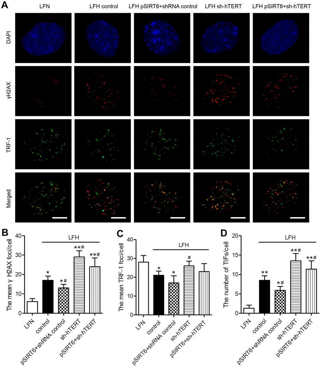 To understand the mechanisms whereby SIRT6 overexpression inhibits premature LFH cellular senescence, we next assessed whether such overexpression was associated with any significant changes in γH2AX foci formation or TIF prevalence within these cells, given that these are reliable markers of DNA damage and telomeric dysfunction. We observed significantly higher numbers of γH2AX foci and telomere dysfunction-induced foci (TIFs) in LFH cells, whereas numbers of TRF-1 foci were decreased relative to LFN cells. Importantly, SIRT6 overexpression significantly decreased the numbers of TIFs and γH2AX foci in LFH cells. In contrast, hTERT knockdown was sufficient to significantly increase the number of γH2AX foci and TIFs within LFH cells, thereby reversing the impact of SIRT6 overexpression on the formation of these foci (Figure 6A–6D). Together, these findings suggest that SIRT6 can protect LFH cells against premature senescence via activating telomerase and thereby preventing DNA damage and telomeric dysfunction.