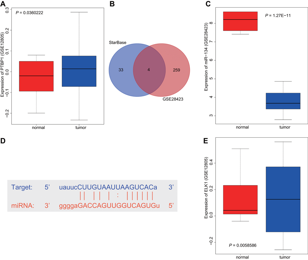 Differential analysis of the osteosarcoma-related microarray data GSE12805 containing tumor tissues (n = 40) and normal tissues (n = 13) was performed using R language with |log2FC|> 1 and p-value < 0.05 as threshold, with results indicating that PTBP1 was upregulated in osteosarcoma (Figure 1A). Next, the StarBase database was utilized to predict the miRNAs that targeted PTBP1. The intersection between the predicted results and differential analysis for tumor tissues (n = 19) and normal tissues (n = 4) in microarray data GSE28423 were obtained, which revealed four miRNAs (hsa-miR-125a-5p, hsa-miR-139-5p, hsa-miR-134-5p, and hsa-miR-137) (Figure 1B). Through GSE28423 differential analysis, miR-134 was detected to be downregulated in osteosarcoma (Figure 1C). The binding sites of miR-134 and PTBP1 were identified via the StarBase database (Figure 1D). Next, to enhance our understanding of the upstream regulation mechanism of miR-134, differential analysis of GSE12805 was conducted, which revealed that ELK1 was highly expressed in osteosarcoma (Figure 1E). Based on the above findings, we concluded that the transcription factor ELK1 may inhibit PTBP1 expression through miR-134 to promote osteosarcoma chemoresistance.