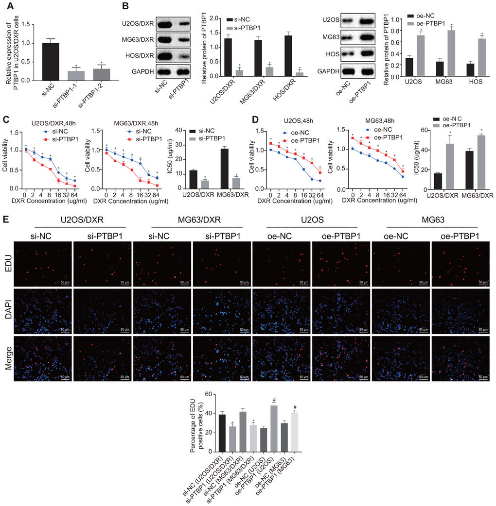 To further ascertain the effect of PTBP1 on the chemotherapy tolerance of osteosarcoma cells, DXR-resistant human osteosarcoma cell lines (MG-63/DXR, HOS/DXR and U2OS/DXR) were transfected with empty vector interference plasmids (si-NC) and PTBP1 interference plasmids (si-PTBP1) respectively. Next, DXR-sensitive osteosarcoma cell lines (MG-63, U2OS and HOS) were transfected with empty vector overexpression plasmids (oe-NC) and PTBP1 overexpression plasmids (oe-PTBP1).