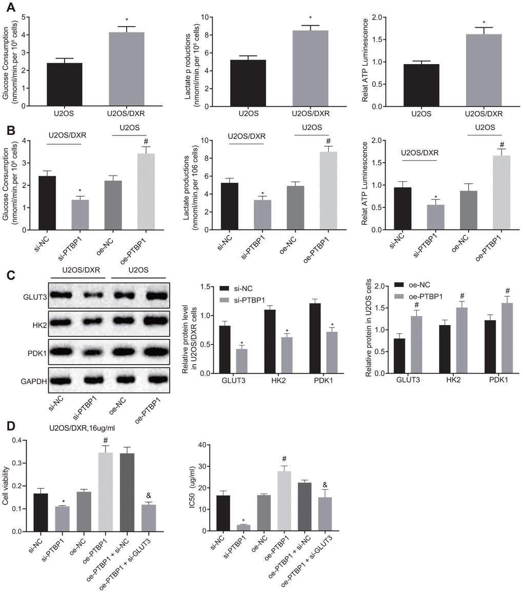 In order to investigate the roles of upregulated PTBP1 expression in the increased intracellular aerobic glycolysis and resistence of osteosarcoma cells to DXR, U2OS/DXR cells were transfected with PTBP1 overexpression plasmids (oe-PTBP1), PTBP1 interference plasmids (si-PTBP1), PTBP1 overexpression plasmid and empty vector silencing plasmids (oe-PTBP1 + si-NC), or PTBP1 overexpression plasmids and GLUT3 silencing plasmids (oe-PTBP1 + si-GLUT3).