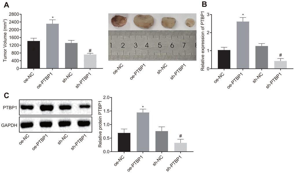 Next, we set out to further ascertain the role of PTBP1 in enhancing DXR resistant osteosarcoma cells in vivo. PTBP1-overexpressed or PTBP1-depleted U2OS/DXR cells were inoculated subcutaneously into nude mice. After the tumors had grown to a size of 50 mm3, the nude mice were treated with DXR, and subsequntly euthanized. The nude mice injected with U2OS cells in the presence of PTBP1 exhibited an elevated tumor volume, while the results in nude mice injected with U2OS cells in the absence of PTBP1 were opposite (p < 0.05) (Figure 5A). RT-qPCR and Western blot analysis results revealed that the expression of PTBP1 was elevated in nude mice injected with PTBP1-overexpressed U2OS cells, and reduced in nude mice injected with PTBP1-depleted U2OS cells (p < 0.05) (Figure 5B, 5C). Altogether, the aforementioned results provided evidence suggesting that the downregulation of PTBP1 suppressed chemoresistance of osteosarcoma cells to DXR in vivo.