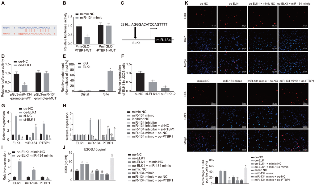 Next, to detect the effect of ELK1, miR-134, and PTBP1 on DXR-resistance, U2OS cells were treated with oe-ELK1 plasmids, miR-134 mimic, and oe-PTBP1 plasmids alone or in combination after DXR treatment. CCK8 and EdU assay (Figure 6J, 6K) revealed increased IC50 and cell viability in ELK1-overexpressed U2OS cells, which was reversed by further miR-134 overexpression in comparison to U2OS cells treated with NC plasmids (p < 0.05). Compared with the U2OS cells treated with mimic NC, IC50 and cell viability were decreased by miR-134 overexpression, but elevated after overexpression of miR-134 and PTBP1 (p < 0.05). These data confirmed that ELK1 promoted chemoresistance of osteosarcoma cells to DXR by inhibiting miR-134 and upregulating PTBP1 expression.