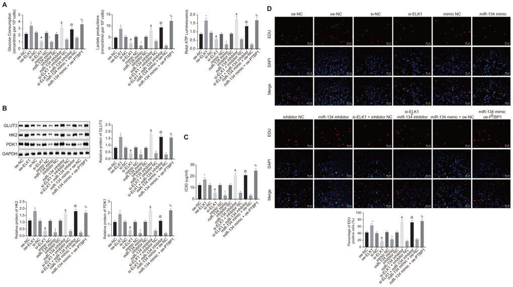 Western blot analysis (Figure 7B) results revealed that the expression of GLUT3, HK2, and PDK1 was elevated in U2OS/DXR cells in the presence of ELK1 or miR-134 inhibitor, but reduced in U2OS/DXR cells in the absence of ELK1 or in the presence of miR-134 mimic (p < 0.05). Compared with U2OS/DXR cells treated with si-ELK1 + inhibitor NC plasmids, ELK1-silenced U2OS/DXR cells treated with exogenous miR-134 inhibitor presented increased expression of GLUT3, HK2, and PDK1, while an opposite trend was identified in PTBP1-overexpressed U2OS/DXR cells treated with exogenous miR-134 mimic in comparison to U2OS/DXR cells treated with miR-134 mimic + oe-NC plasmids (p < 0.05).