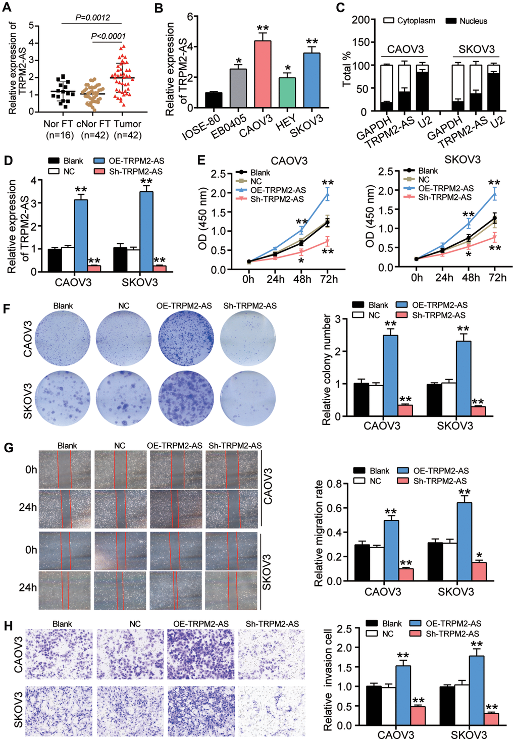 The expression of TRPM2-AS was first detected in OvC tissues and cells to identify the role of TRPM2-AS in OvC. Given the fallopian tube was the most important origin of OvC [25, 26], we detected the expression of TRPM2-AS in 42 OvC tissue samples and the paired contralateral fallopian tube tissues. Our experimental results demonstrated that the expression of TRPM2-AS in OvC tissues increased by 2-fold compared to that in the contralateral normal fallopian tube tissues. As for the normal fallopian tube tissues from 16 patients with benign gynecological tumors that were collected to also serve as the control, we found a significantly lower TRPM2-AS expression in contrast to OvC tissues (Figure 1A). Similarly, the expression of TRPM2-AS was found to be upregulated in four OvC cell lines (EB0405, CAOV3, HEY and SKOV3). Compared to IOSE-80 cell line (human ovarian surface epithelial cells), the TRPM2-AS with more than 3-fold upregulation was observed in CAOV3 and SKOV3 cells (Figure 1B). Hence, CAOV3 and SKOV3 cells were selected to perform subsequent experiments, and both of the two OvC cell lines derives from the patients with high-grade serous carcinoma (HGSC), which is the most common subtype of ovarian cancer. After analyzing the results of nuclear and cytoplasmic fractionation and qRT-PCR, we observed that TRPM2-AS was mainly distributed in the cell cytoplasm (Figure 1C). The sh-TRPM2-AS (TRPM2-AS shRNA) and OE-TRPM2-AS (TRPM2-AS overexpression) vectors transfection respectively led to significantly downregulated and upregulated TRPM2-AS in CAOV3 and SKOV3 cells, suggesting the efficient transfection (Figure 1D). Our findings also revealed that the viability of the OE-TRPM2-AS group was enhanced at 48 and 72 hours, while sh-TRPM2-AS impaired the viability of both CAOV3 and SKOV3 cell lines (Figure 1E). The colony formation assay results indicated that the colony-forming ability was enhanced by more than 50% by OE-TRPM2-AS transfection, whereas sh-TRPM2-AS impaired the colony-forming ability by about 60% in both OvC cell lines (Figure 1F). We observed a similar trend in the wound-healing assay results, which showed that TRPM2-AS overexpression elevated the migration rate by 1.7-fold in CAOV3 cells and 2.1-fold in SKOV3 cells but that TRPM2-AS silence impeded the migration rate (Figure 1G). Finally, we noticed that the cell-invasive capability was enhanced by more than 50% in the OE-TRPM2-AS group, while a 50% decrease in the cell invasion capability was observed in the sh-TRPM2-AS group (Figure 1H).