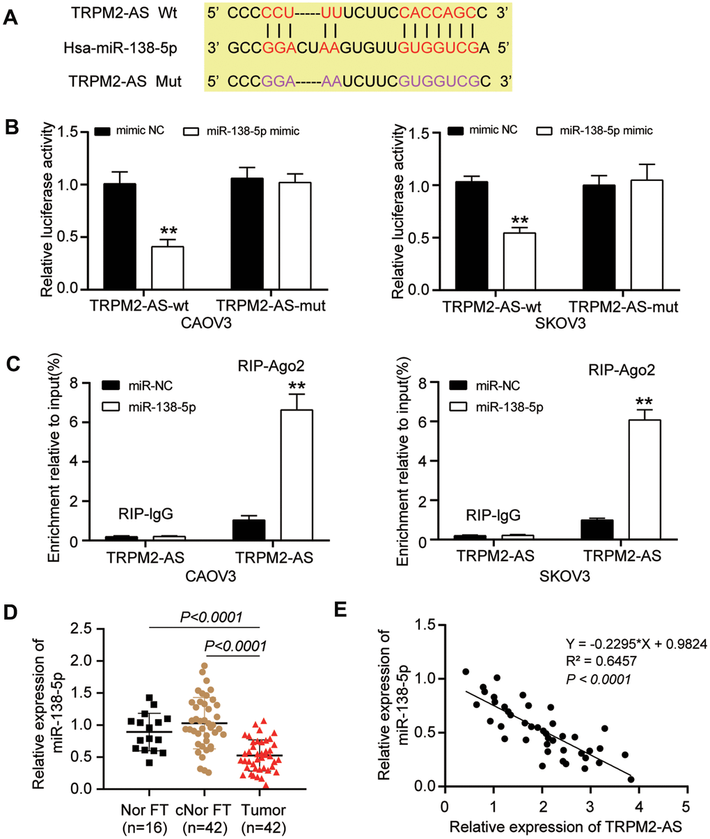 The binding site between TRPM2-AS and miR-138-5p was predicted using the ENCORI starBase system. The wild-type (WT) TRPM2-AS contained the binding site, while the binding site was mutated from “CCUUU-----CACCAGC” to “GGAAA-----GUGGUCG” as the mutant (Mut) TRPM2-AS (Figure 3A). The luciferase reporter assay result showed a 50% decrease in the luciferase activity in the cells co-transfected with TRPM2-AS-WT and miR-138-5p mimic; however, TRPM2-AS-Mut could not affect the luciferase activity in CAOV3 and SKOV3 cells (Figure 3B). The RIP assay results further validated the binding site between TRPM2-AS and miR-138-5p (Figure 3C). Apart from that, the expression of miR-138-5p was measured in 42 paired ovarian tumor tissues and contralateral normal fallopian tube tissues, and 16 normal fallopian tube tissues from patients with benign gynecological tumors. The result displayed that the miR-138-5p was downregulated by nearly 50% in ovarian tumor tissues in contrast to both the contralateral normal fallopian tube tissues and the normal fallopian tube tissues from patients with benign gynecological tumors (Figure 3D). Besides, the Pearson correlation analysis showed that TRPM2-AS expression was negatively correlated with miR-138-5p expression in OvC tumor tissues (Figure 3E).