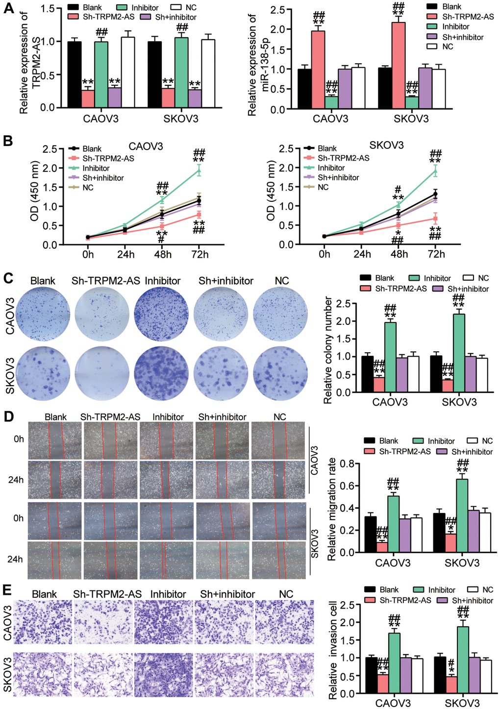 Because of the negative correlation between TRPM2-AS and miR-138-5p, the function of the TRPM2-AS/miR-138-5p axis in OvC cells was further explored. Using qRT-PCR, the transfection efficiency of sh- TRPM2-AS and miR-138-5p inhibitor was validated in CAOV3 and SKOV3 cells. The result showed that sh-TRPM2-AS reduced TRPM2-AS expression by 70% and elevated miR-138-5p expression by 2-fold. Even though miR-138-5p inhibitor downregulated miR-138-5p by 70%, it had no effect on TRPM2-AS expression (Figure 4A). As shown in Figure 4B, the miR-138-5p inhibitor enhanced the viability of CAOV3 and SKOV3 cells. Nonetheless, co-transfecting the cells with sh-TRPM2-AS attenuated the promotive role of the miR-138-5p inhibitor on cell viability. The colony formation assay results displayed that the number of colonies in the cells transfected with the miR-138-5p inhibitor was twice that of the blank control cells. However, the number of colonies in the cells co-transfected with sh-TRPM2-AS and the miR-138-5p inhibitor was similar to that of the blank control cells (Figure 4C). Similar to the colony formation assay findings, the wound-healing assay results revealed that the miR-138-5p inhibitor not only promoted cell migration but also reversed the inhibitory effect of sh-TRPM2-AS on cell migration (Figure 4D). Besides, the miR-138-5p inhibitor increased cell invasion by 50% and impaired the inhibitory effect of sh-TRPM2-AS on cell invasion (Figure 4E).