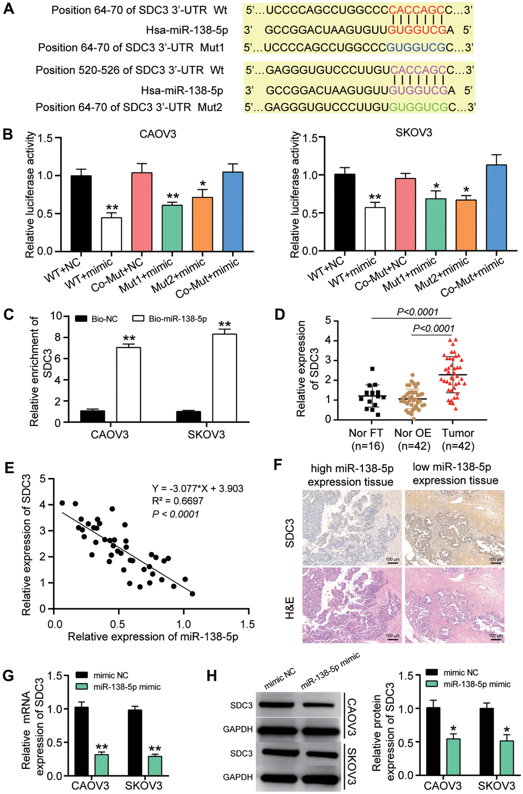 TargetScan was employed to predict the two binding sites of SDC3 3’UTR for miR-138-5p (Figure 5A). The two binding sites on SDC3 mRNA 3’UTR were first mutated before performing luciferase assay. The luciferase reporter assay results showed that the lowest luciferase activity (a 50% decrease) was observed when the wild-type SDC3 mRNA 3’UTR and miR-138-5p mimic was co-transfected (Figure 5B). The RNA pull-down assay analysis further proved that the SDC3 mRNA could be pulled down when the cells were transfected with the biotin-labeled miR-138-5p mimic (Figure 5C). In our clinical specimens, the SDC3 expression was upregulated by approximately 2-fold in OvC tissues compared to both contralateral normal fallopian tube tissues and normal fallopian tube tissues from patients with benign gynecological tumors (Figure 5D). The subsequent correlation analysis revealed that the SDC3 mRNA expression was negatively correlated with miR-138-5p expression in OvC tissues (Figure 5E). The IHC assay result further confirmed that while the expression of SDC3 was high in the ovarian tumor tissues with lower expression of miR-138-5p, the expression of SDC3 was low in the ovarian tumor tissues with higher expression of miR-138-5p (Figure 5F). In CAOV3 and SKOV3 cells, the expression of SDC3 mRNA and protein was reduced by 75% and 50%, respectively, in the miR-138-5p mimic transfection group (Figure 5G, 5H).