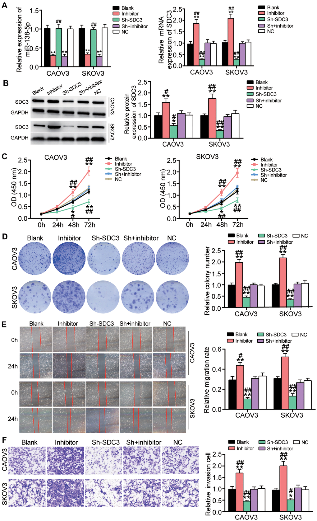 The transfection efficiency of sh-SDC3 and miR-138-5p inhibitor in OvC cells was detected before performing the cell-function experiments. Findings demonstrated that the transfection of sh-SDC3 and miR-138-5p inhibitor, respectively, reduced SDC3 expression and miR-138-5p expression by 70%. It was also found that miR-138-5p inhibition enhanced SDC3 expression by 2-fold; nonetheless, sh-SDC3 did not affect miR-138-5p expression (Figure 6A). The western blot assay results further confirmed that miR-138-5p inhibition elevated SDC3 protein level by more than 1.5-fold and that the SDC3 protein level was reduced by approximately 50% in the sh-SDC3 group (Figure 6B). Next, the result of the CCK8 assay, which was used to evaluate cell viability, indicated that sh-SDC3 impaired the cell viability at 48 and 72 hours; however, this inhibitory effect was neutralized by the promotive effect of the miR-138-5p inhibitor (Figure 6C). Similarly, the sh-SDC3 transfection inhibited colony formation and attenuated the promotive role of the miR-138-5p inhibitor on colony formation (Figure 6D). Experimental investigations also displayed that the cell migration rate was reduced by 60% in the cells transfected with sh-SDC3 compared to the blank group, while the cell migration rate of the sh-SDC3 and miR-138-5p inhibitor group was similar to that of the blank control group (Figure 6E). Similar to the cell migration assay result, the sh-SDC3 transfection inhibited cell invasion by more than 50%, and reversed the positive role of the miR-138-5p inhibitor on cell invasion (Figure 6F).