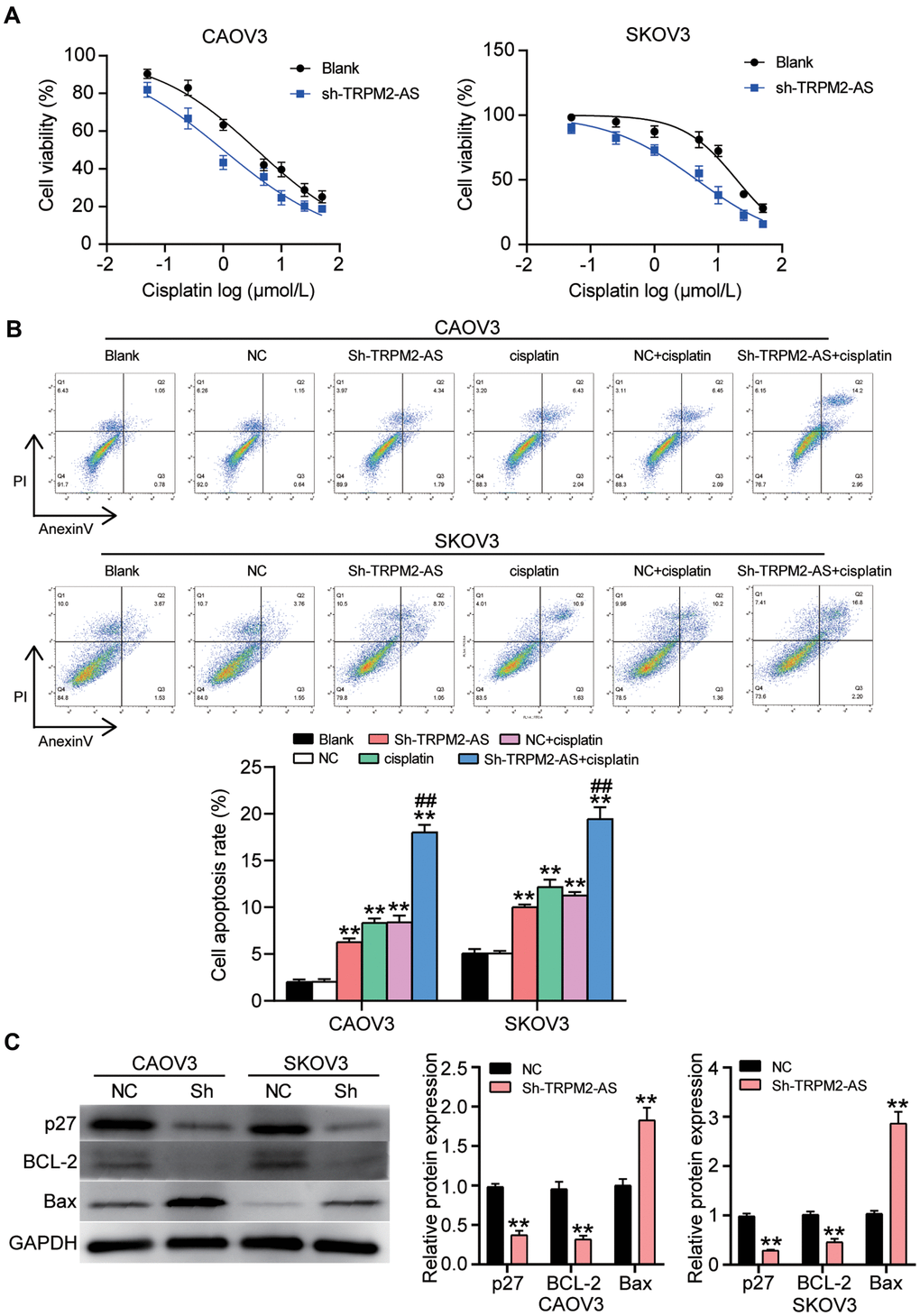 To identify the effect of TRPM2-AS on cisplatin resistance in OvC, we treated CAOV3 and SKOV3 cells transfected with sh-TRPM2-AS or negative control (NC) with various concentrations of cisplatin. The cell viability was detected using the CCK8 assay. The CCK8 assay results showed that the IC50 of CAOV3 and SKOV3 cells in the NC group treated with cisplatin was 3.78 μmol/L and 19.51 μmol/L, respectively. These values respectively decreased to 1.01 μmol/L and 4.61 μmol/L when TRPM2-AS was simultaneously silenced (Figure 7A). After that, the cell apoptosis rate was detected in the OvC cells transfected with sh-TRPM2-AS and simultaneously treated with cisplatin using the corresponding IC50 concentration. We observed that sh-TRPM2-AS significantly enhanced the apoptosis-promoting effect of the cisplatin (Figure 7B). We also detected the expression of the apoptosis-associated protein (p27, BCL-2 and Bax) in CAOV3 and SKOV3 cells with TRPM2-AS knockdown and treated with cisplatin (1.01 μmol/L for CAOV3 cell line and 4.61 μmol/L for SKOV3 cell line). The results displayed that TRPM2-AS knockdown and the simultaneous cisplatin treatment decreased the protein expression of p27 and BCL-2, and increased the expression of Bax by around 2-fold in OvC cells (Figure 7C).