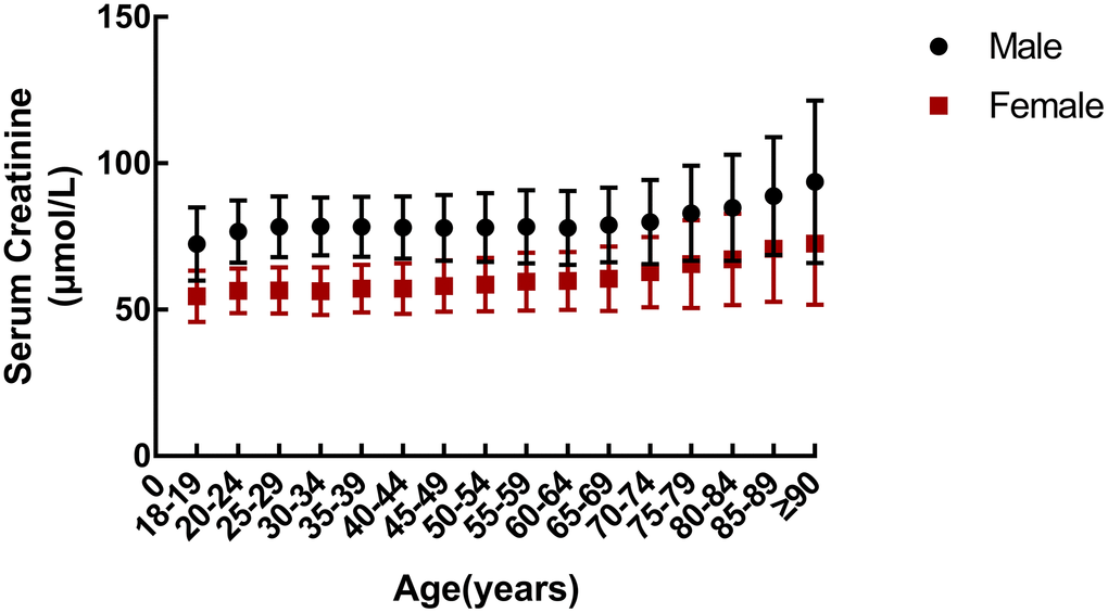 Owing to the notable increase in the elderly population of China, there is a clear need to investigate the effect of age-related changes in human health. The kidney is an important organ that removes metabolites, waste products, and toxins, from the body, while retaining water and other useful substances by reabsorption. Aging is associated with a functional decline in the kidney that can have a significant impact on health. A global study, carried out in 2017, reported that there were 697.5 million patients with chronic kidney disease (CKD), thus representing 9.1% of the global population [1]. Furthermore, data from the same study reported that there were 132.3 million patients with CKD in China [1]. A number of studies, carried out in different countries, have concluded that kidney function does not decline with age in every individual [2, 3]. In the present study, we aimed to investigate age-related changes in kidney function within the Chinese population.