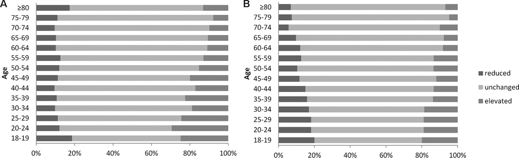 We used the CKD-EPI equation to calculate changes in eGFR over the three-year study period. For this analysis, subjects were divided into three groups: an ‘elevated’ group (an increase in eGFR that was >5 ml/min/1.73m2) [13], a ‘reduced’ group (a decrease in eGFR that was >-5 ml/min/1.73m2), and an unchanged group (representing changes that lay between the two other groups). The eGFR of most subjects remained unchanged across the three-year period; thus was more common in the elderly did not show changes (see Figure 2, Supplementary Tables 3, 4). There were still significant differences in the change in eGFR when compared between different age groups (male: χ2=248.24, P=0.000; female: χ2=209.43, P=0.000). The eGFR changes and age were negatively correlated (B=-0.27, P=0.000). These indicated that the elderly eGFR was less likely to change over a period of time. We also compared changes in sCr across all subjects (Table 1); no significant changes in sCr levels were evident in any of the age groups over the three-year study period.