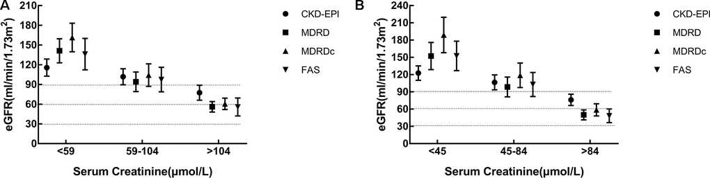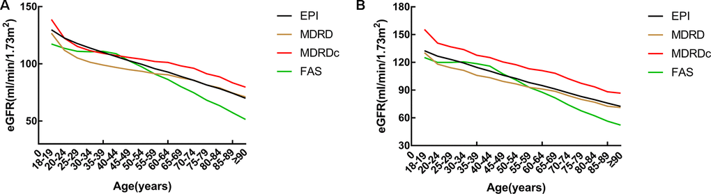 The purpose of this study was to investigate age-related change in the renal function of healthy subjects in Beijing, and to compare the significance of five different eGFR equations for the assessment of renal function in the Chinese population. Previous research has established that eGFR equations rely on two main variables: serum creatinine and age. Therefore, we focused on the use of serum creatinine to investigate the relationship between renal function and age, rather than eGFR.