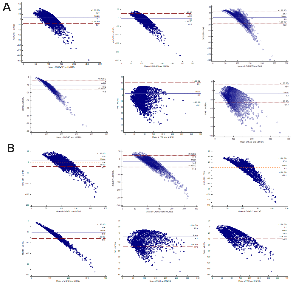 We then applied the Bland-Altman statistical method to analyze consistency between various equations. As can be seen from Figure 4, the CKD-EPI equation was consistent with the MDRD, MDRDc, and FAS equations, while the FAS equation was in good agreement with the MDRD and MDRDc equations. The MDRD and MDRDc equations showed poor consistency, and the MDRD equation was generally better than the MDRDc equation, when evaluating renal function.