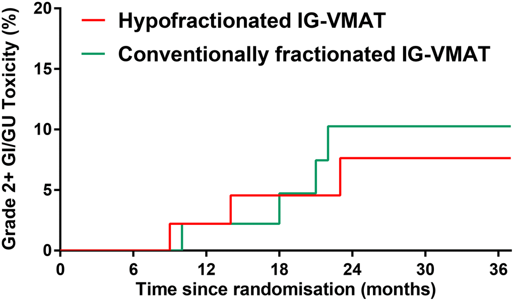 The chi-square or Fisher exact test was used for testing relationships between variables. Time to first occurrence of late radiation-induced side effects was analyzed using the Kaplan–Meier method to calculate the cumulative proportion with events reported on 2-year assessment. The log-rank test was used to compare hypofractionated IG-VMAT and conventionally fractionated IG-VMAT. Statistical calculations were performed using SPSS 16.0 (SPSS Inc., Chicago, IL, USA).