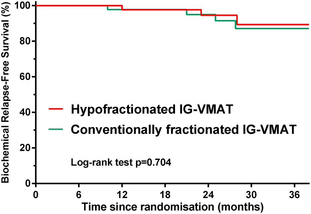The main limitation of this trial was that the small sample size and the low frequency of events made efficacy analysis difficult; however, the results are entirely consistent with other trials [16–25]. Second, only bRFS was used to assess effectiveness of IG-VMAT. The data for bRFS or overall survival is not yet mature due to the short follow-up time. Despite these limitations, the results of this study can be helpful when designing a large multicenter phase III randomized trial of imaging-guided moderately hypofractionated VMAT versus conventionally fractionated VMAT in the modern radiotherapy era.