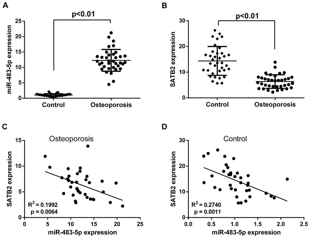 The effects of miR-483-5p and SATB2 on osteoporosis were investigated by comparing their expression levels in postmenopausal patients with and without osteoporosis. qRT-PCR results revealed that the miR-483-5p expression level was greater (Figure 1A) and that of SATB2 was lower (Figure 1B) in patients with osteoporosis compared to the control. Besides, Pearson correlation test unveiled a significant negative association between miR-483-5p and SATB2 in both osteoporosis (Figure 1C) and control patients (Figure 1D), suggesting the participation of miR-483-5p and SATB2 for the osteoporosis occurrence.