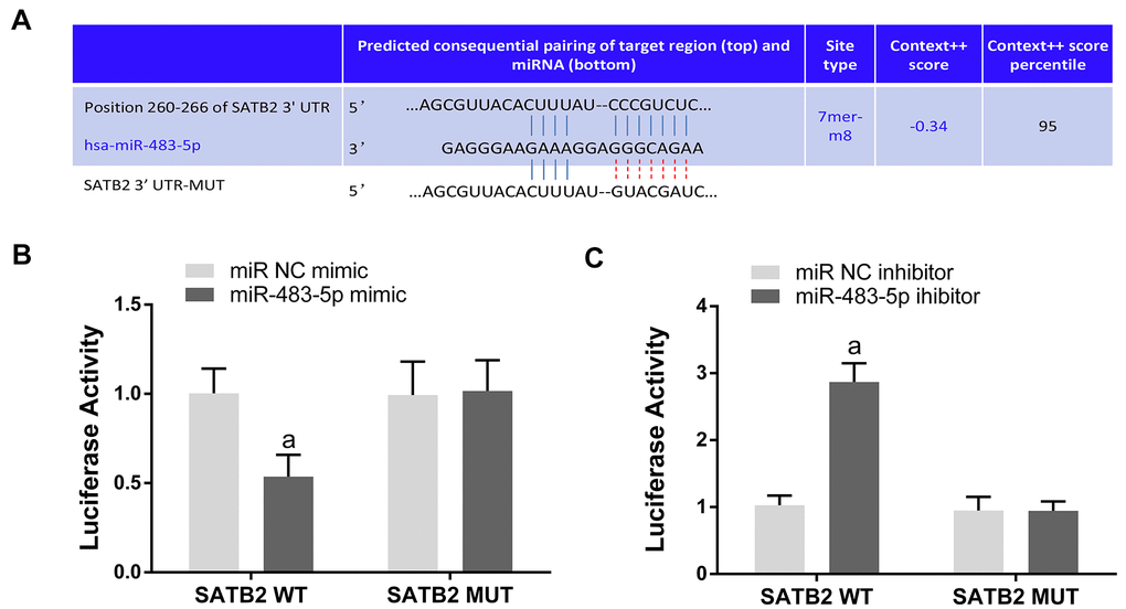 Statistical analyses were carried out with SPSS software (v. 22.0; SPSS Inc., Chicago, IL). The data were showed as mean ± standard deviation (SD). The differences between multiple comparisons were evaluated by one-way analysis of variance (ANOVA) followed by a post hoc Tukey test. The association between SATB2 and miR-483-5p was analyzed by Pearson analysis. P < 0.05 indicated statistically significant.