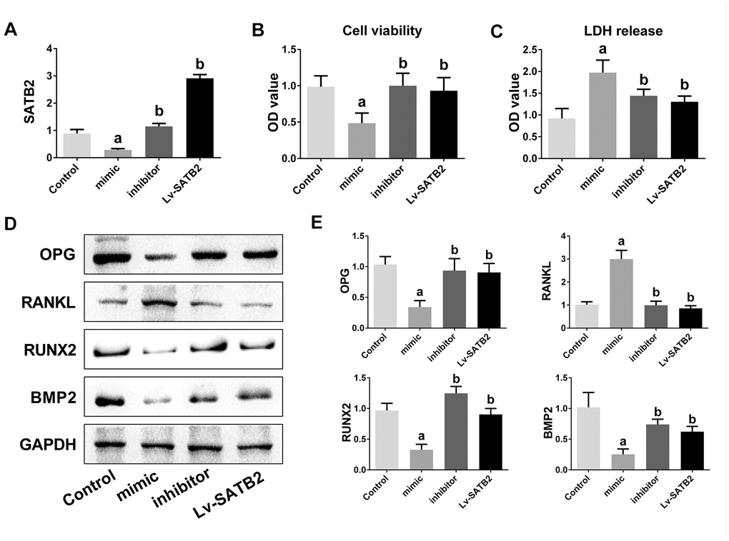 To investigate the biological function of miR-483-5p and SATB2 on osteogenic differentiation, MC3T3-E1 cells were co-transfected with miR-483-5p inhibitor, miR-483-5p mimic or SATB2-overexpressed lentiviruses (Lv-SATB2). qRT-PCR was employed to certify the efficiency of the transfection (Figure 3A). Cell viability was significantly decreased in miR-483-5p mimic transfected cells and recovered after transfection of miR-483-5p inhibitor or Lv-SATB2 (Figure 3B). In addition, miR-483-5p mimic enhanced the LDH level while the miR-483-5p inhibitor and Lv-SATB2 decreased the LDH release (Figure 3C). The OPG/RANKL ratio is a fundamental indicator of the bone resorption and formation balance. Western blot results unveiled that OPG expression was significantly reduced in miR-483-5p mimic transfected cells, while the RANKL expression increased in the same condition. The OPG/RANKL rate was reversed after miR-483-5p inhibitor or Lv-SATB2 treatment. Moreover, miR-483-5p mimic decreased the expression level of RUNX2 and BMP2, which were two crucial mediators of osteogenic differentiation. Likewise, miR-483-5p inhibitor and Lv-SATB2 also reversed the expression of RUNX2 and BMP2 (Figure 3D, 3E).
